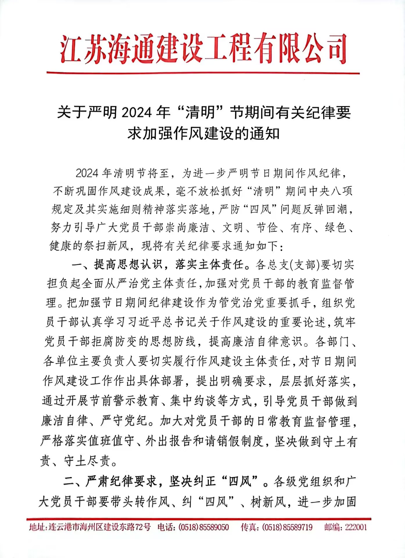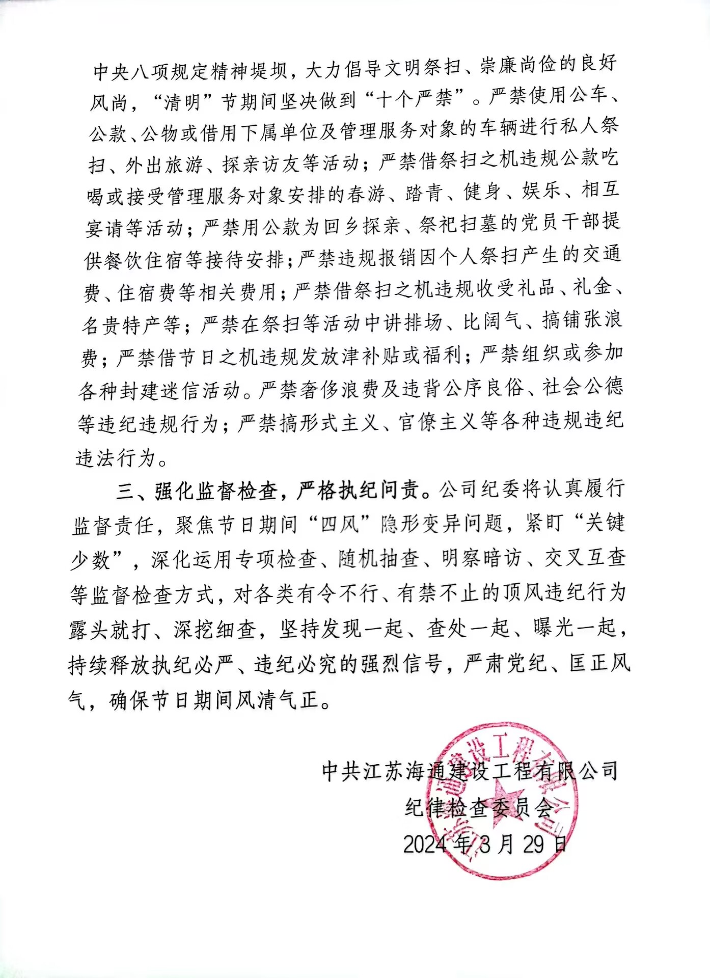 2024年清明节将至,为进一步严明工作纪律,严守廉洁防线,防止节日期间滋生“四风”问题,江苏海建千亿官方网页版纪委发出通知,提醒广大党员干部严格遵守中央八项规定精神,倡导廉洁、安全、文明、节俭、绿色的祭扫新风尚。