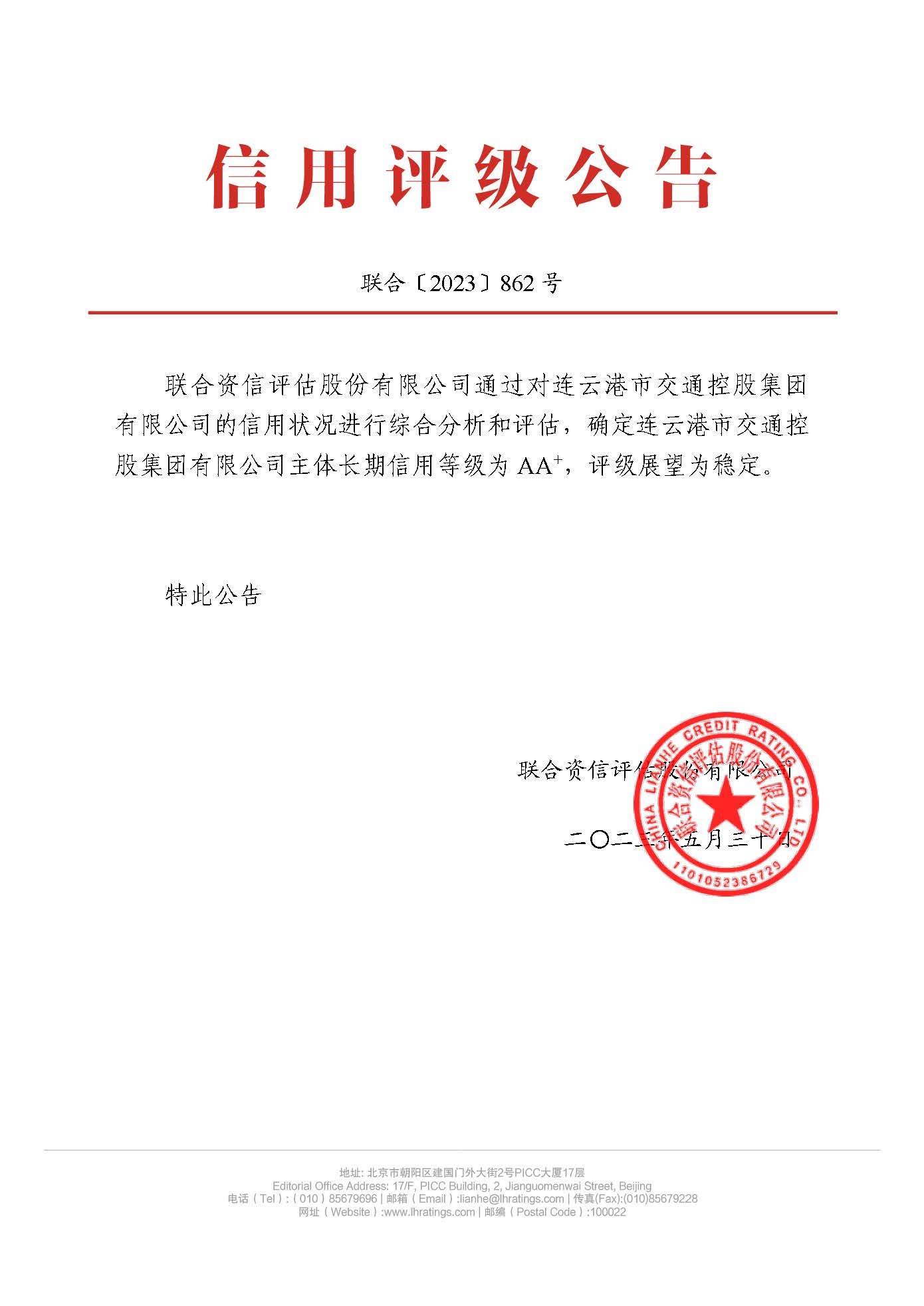 联合资信评估股份有限千亿官方网页版是目前中国最专业、最具规模的信用评级机构之一,此次获得国内权威评级机构联合资信的AA+主体长期信用评级,充分反映出市场对交通控股千亿(中国)有限千亿官方网页版近年经营发展成果的高度认可。