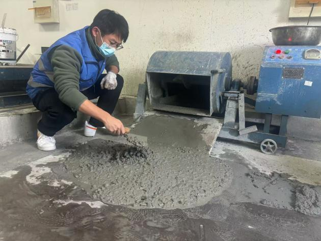 实验人员根据基地现有的砂、石含泥量与含水率,粗骨料的级配比例,一同将目前所需要的配合比(C20、C25、C30、C35、C40、C45、C50、C55)进行优化调整。从取样、拌和到成型试块,实验人员严格遵循规范要求,防止出现泌水、离析等现象,从源头把控混凝土质量,确保后料台打出每一车的混凝土均能满足施工现场要求。