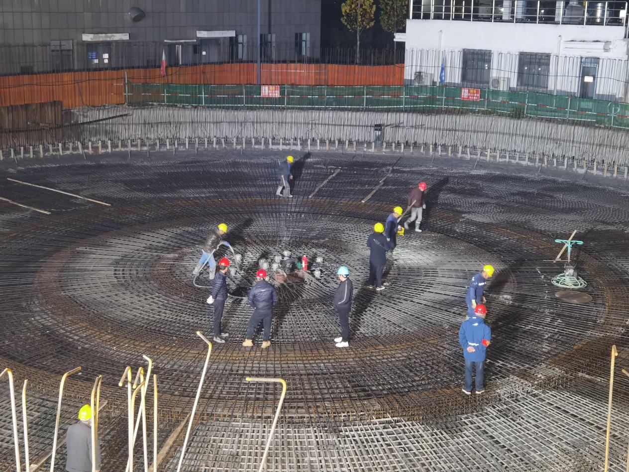 初冬的夜晚已是寒风凛冽,而在施工现场,工人们正在紧锣密鼓地对二沉池底板进行着混凝土浇筑施工。本次浇筑的二沉池底板混凝土,方量为820m3,需要连续浇筑、一次成型,浇筑于11月24日上午6点30分开始,次日凌晨4点结束。连续作业中,高达十多米的泵车,将搅拌车上的混凝土浇筑到二沉池底板的不同位置,项目部施工员桂志强、安全员吴运祥等人一直坚守在自己的岗位上,引导泵车导管向底板浇筑着混凝土。灯光的照耀下,大家干劲十足,忙碌不停,有的在检查预埋管道位置,有的忙着对刚浇筑的混凝土振捣密实,整个施工现场忙而不乱,井井有条,争分夺秒,奋力推进工程建设。