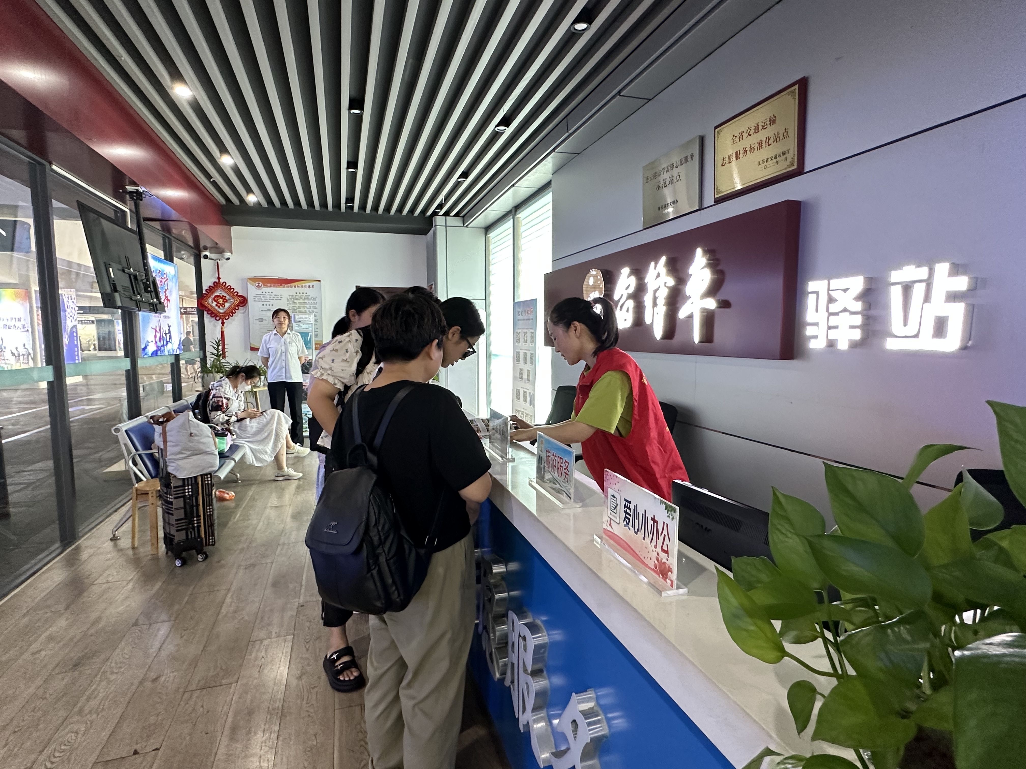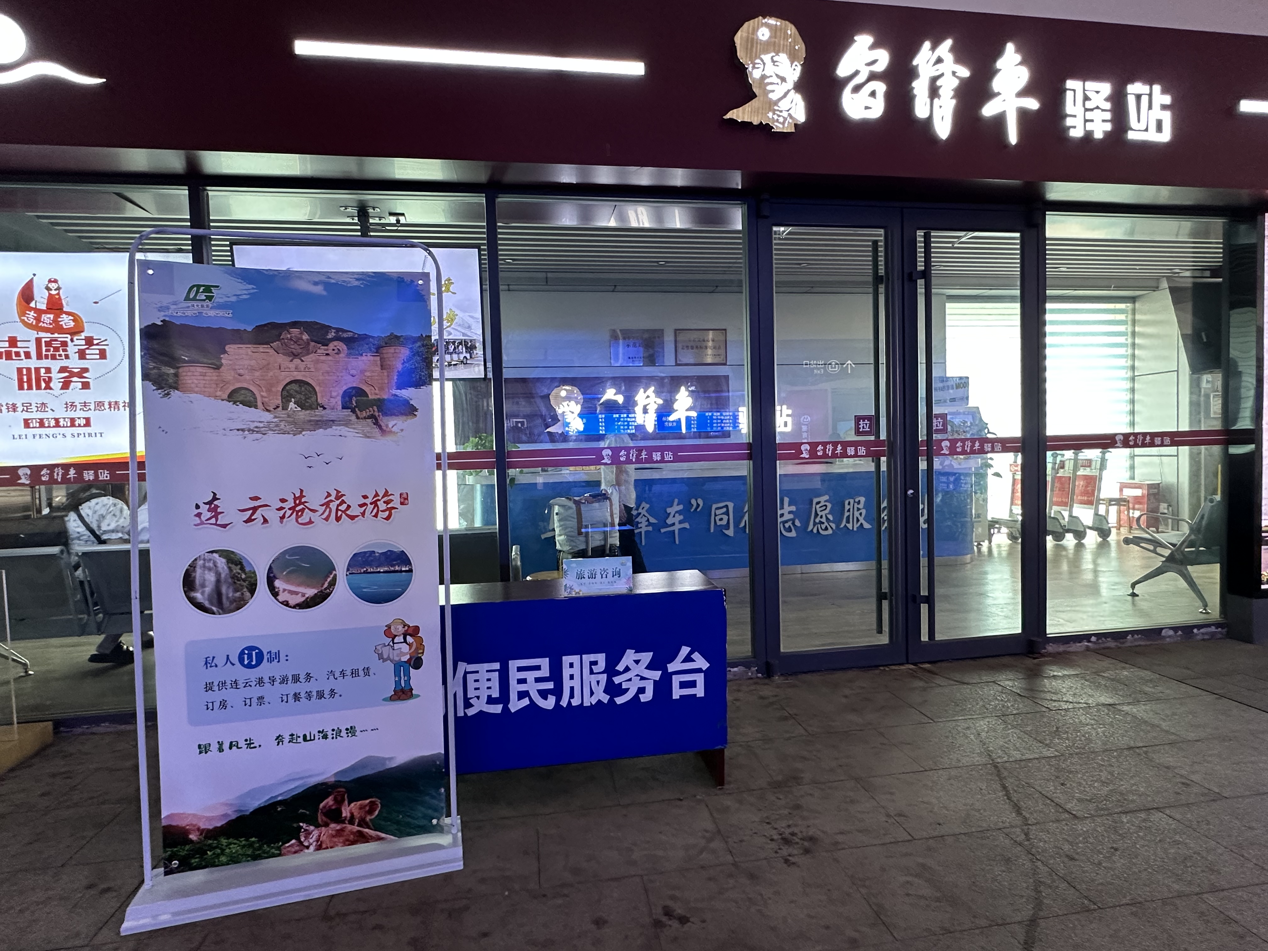 风光国际旅行社在“雷锋车”驿站设立旅游咨询服务台,摆放连云港各个景区资料,并在高铁站出站口醒目位置树立连云港旅游宣传海报。工作人员身穿红色志愿者马甲迎接来自全国各地的出站旅客,热情的为他们指路、介绍连云港的旅游攻略,并根据旅客的具体需求,个性化安排连云港旅游服务,包括订票、订房、订餐、导游服务及汽车租赁等,并且在每个环节都赋予外地游客专属的体验。