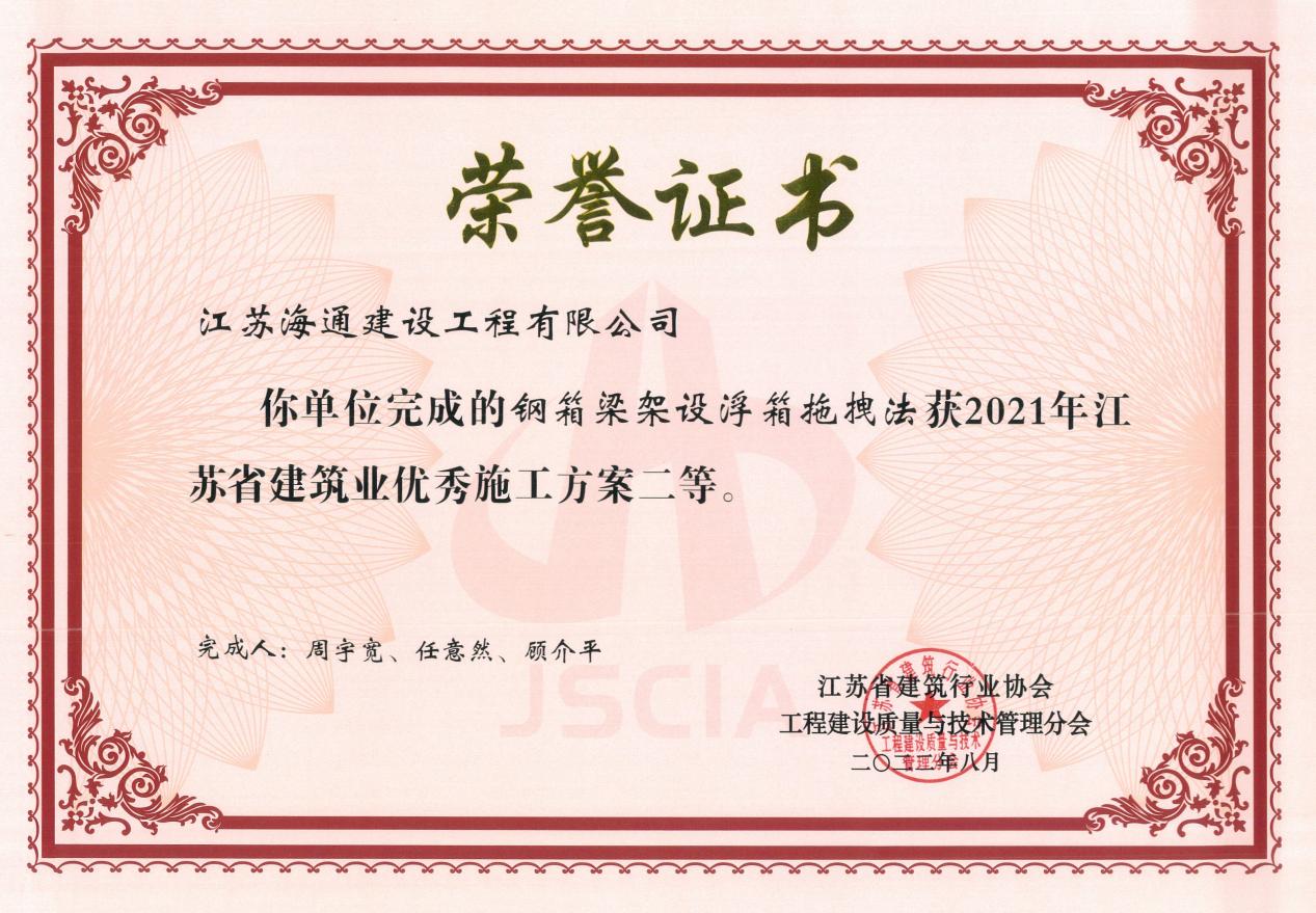 近日,从江苏省建筑行业协会《关于发布2021年江苏省建筑业优秀施工方案评价工作结果的通知》(苏建质协[2022]10号)文件中获悉,江苏海建千亿官方网页版申报的《钢箱梁架设浮箱拖拽法施工方案》荣获2021年度江苏省建筑业优秀施工方案二等奖。