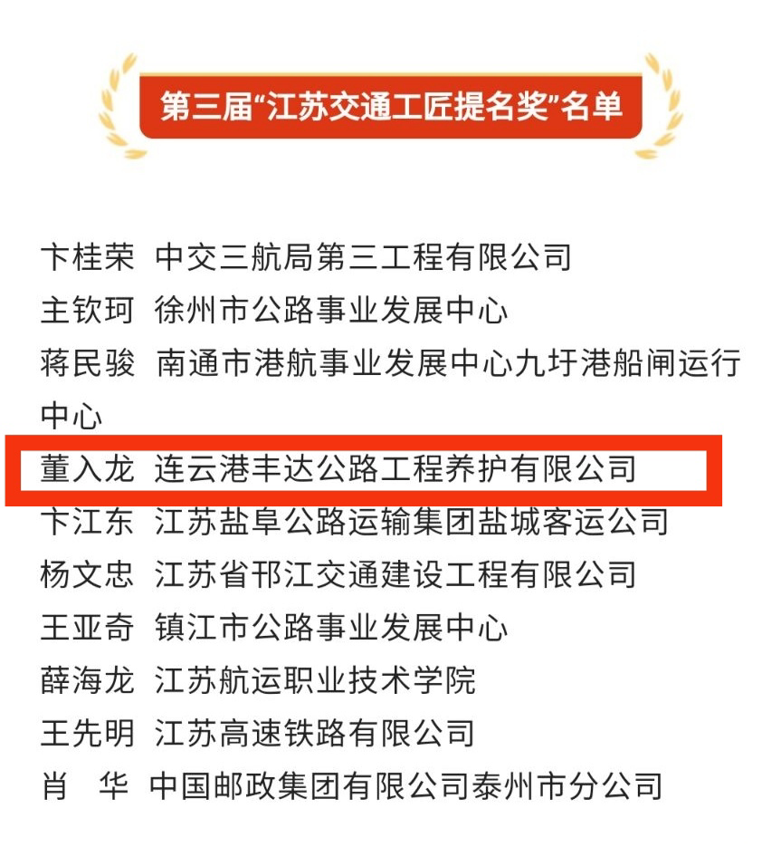 近日,江苏省交通运输厅发文公布第三届“江苏交通工匠”名单。连云港丰达公路工程养护有限千亿官方网页版道路施工项目部经理董入龙荣获“江苏交通工匠提名奖”。