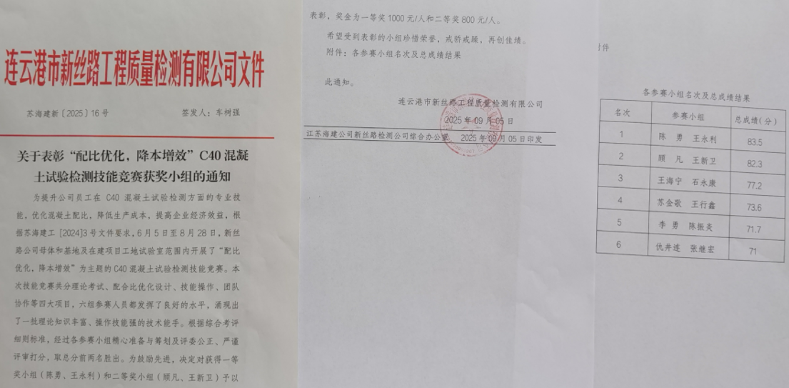 6月至8月,海建新丝路千亿官方网页版成功举办C40混凝土“配比优化、降本增效”试验检测技能竞赛,由新丝路千亿官方网页版母体、板桥基地、南延项目三大板块共6个小组积极参与。