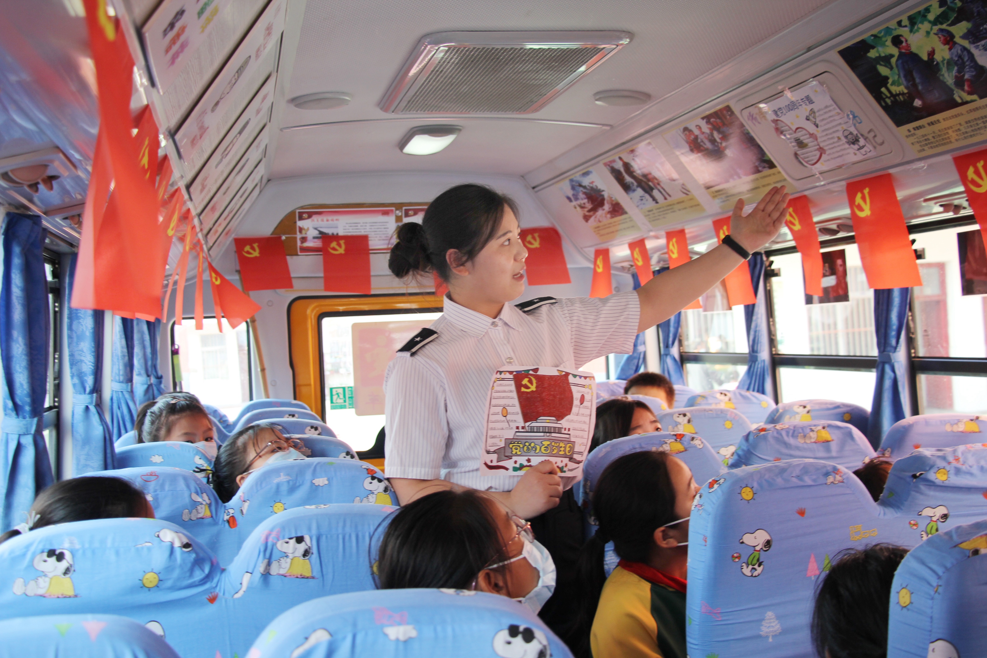 灌云欣达校车坚持以校车为公益宣传载体,精心策划打造“流动党史车厢”,将校车打造成为孩子们党史学习教育的生动课堂。为营造党史学习氛围,激发孩子们学习党史的热情,灌云欣达校车结合实际,将主题车厢设计得活泼、新颖,好似流动的党史知识课堂,让孩子们眼前一亮。校车内不但有党史书籍,画报等供孩子们阅读,还不定期邀请党员随车开展党史讲座,真正将校车车厢打造成传播党史文化、开展党史宣传教育的流动课堂。