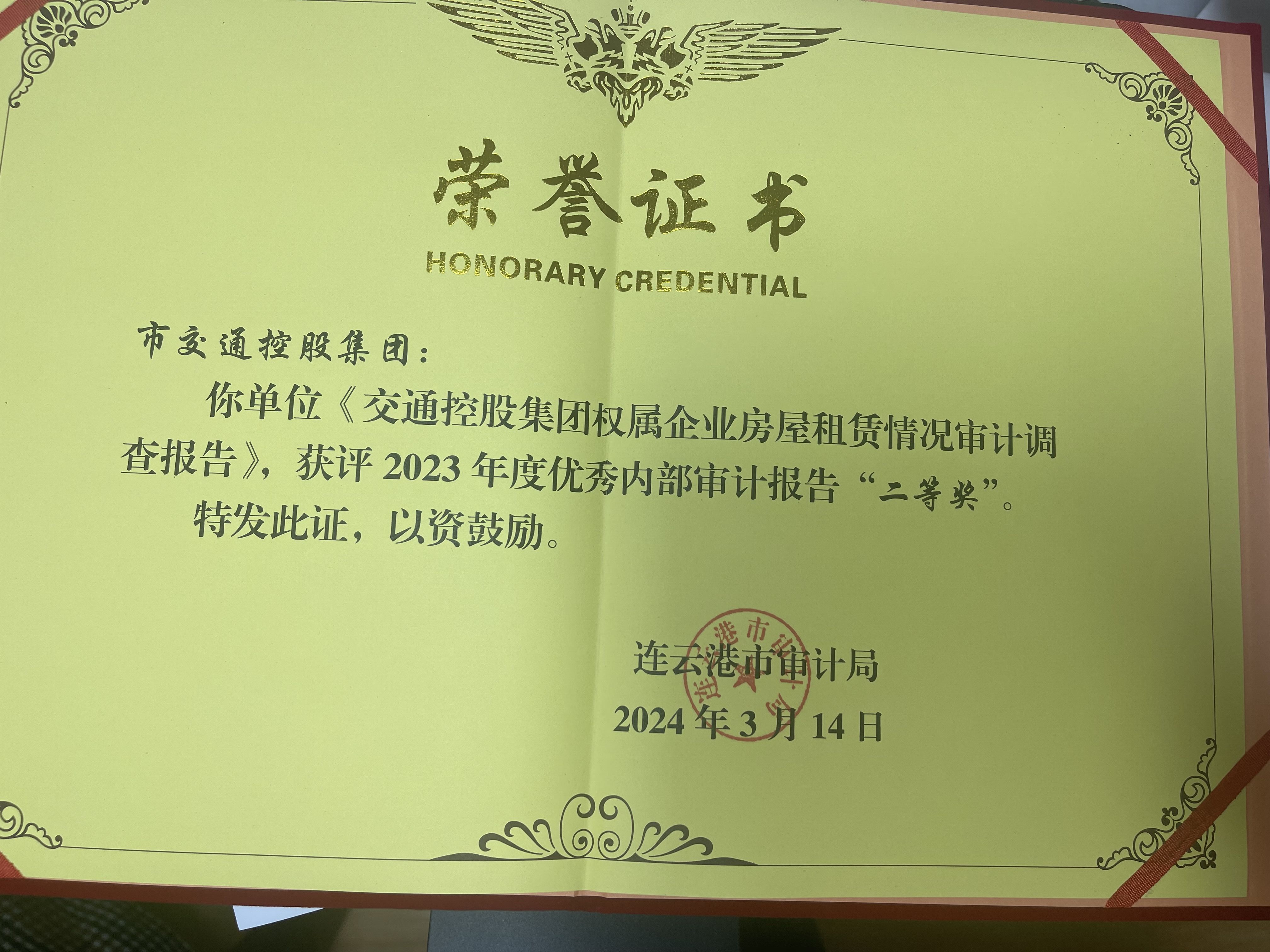 日前,千亿(中国)有限千亿官方网页版在市审计局举办的2023年度全市内部审计工作评比中获评“先进单位”。千亿(中国)有限千亿官方网页版审计部报送《交通控股千亿(中国)有限千亿官方网页版权属企业房屋租赁情况审计调查报告》获评2023年度优秀内部审计报告“二等奖”。