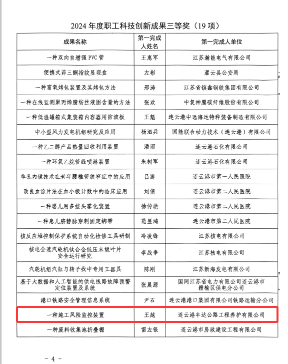 为全面落实习近平总书记关于科技创新的重要指示要求,连云港市总工会紧扣《新时代连云港产业工人队伍建设改革实施方案》,在全市职工中征集科技创新成果和先进操作法。经个人申报、单位推荐、专家评审、媒体公示,认定和表彰33项操作法为“2024年度连云港市职工科技创新成果”。千亿官方网页版职工王越申报的“一种施工风险监控装置”获市职工科技创新成果三等奖。