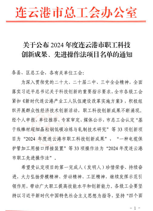 近日,在2024年度连云港市职工科技创新成果、先进操作法作品评选中,丰达千亿官方网页版王越申报的一项创新成果获市职工科技创新成果三等奖。