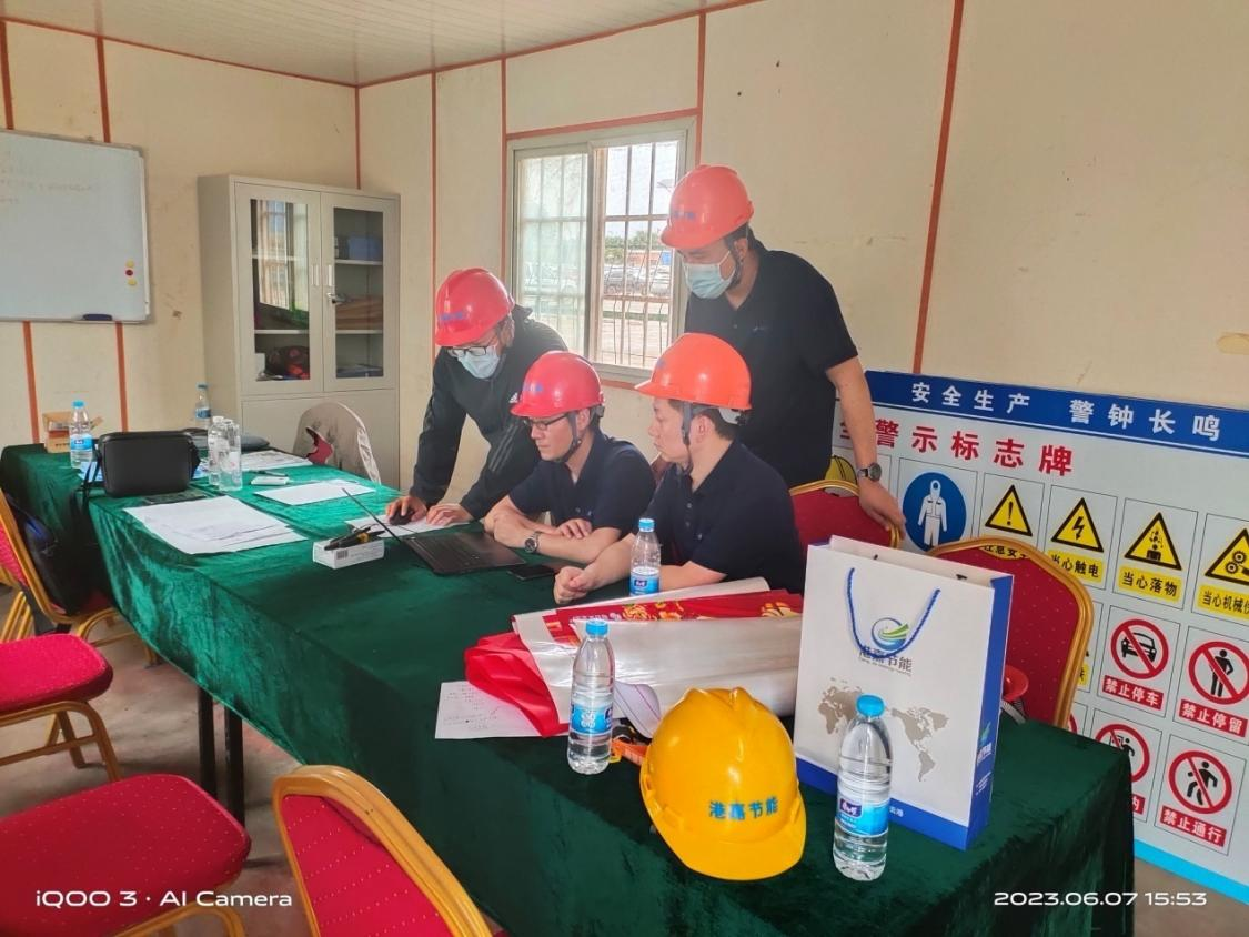 在检查检查现场,江智慧听取了项目部的近期工作汇报,要求项目部全体员工及参建单位现场人员积极参与到中远海运金风科技与东方国际集装箱厂的安全生产月活动,并对“安全生产月”相关工作进行部署,同时提出四点主要意见:一是要紧紧围绕安全生产月活动的主题精神,以“安全生产月”活动为契机,保证项目质量与进度,确保“安全生产月”活动取得实实在在的效果;二是要求项目抢抓机遇、全面推进,结合箱厂生产情况见缝插针,尽快完成交流侧并网接线和调试;三是要突出重点、监督落实到位,认真做好当前开卷车间屋面的安全生产工作,重大风险超前防范,全面提升抵御风险能力和应急处置能力;四是要针对入夏以来天气变热、屋面温度较高、施工作业难度增大等问题,项目部要做好应对措施,备好降暑、解暑物资,防止工人中暑,做到开开心心上班、平平安安下班。
