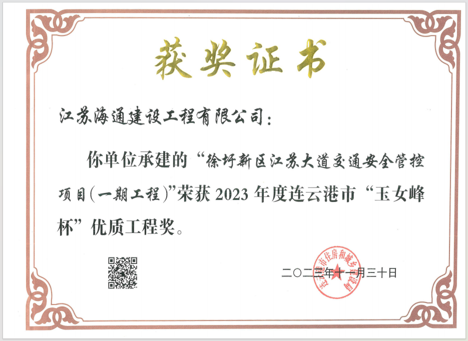 近日,从连云港住房和城乡建设局获悉,江苏海建千亿官方网页版徐圩新区江苏大道交通安全管控项目(一期工程)荣获2023年度连云港市“玉女峰杯”优质工程奖。