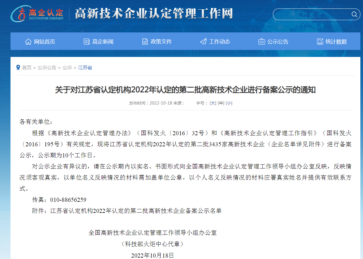 2022年10月17日,全国高新技术企业认定管理工作领导小组办公室发布了《江苏省认定机构2022年认定的第二批高新技术企业备案公示名单》,江苏明茂新能源科技有限千亿官方网页版(以下简称“明茂千亿官方网页版”)榜上有名,明茂千亿官方网页版成功通过高新技术企业认定。
