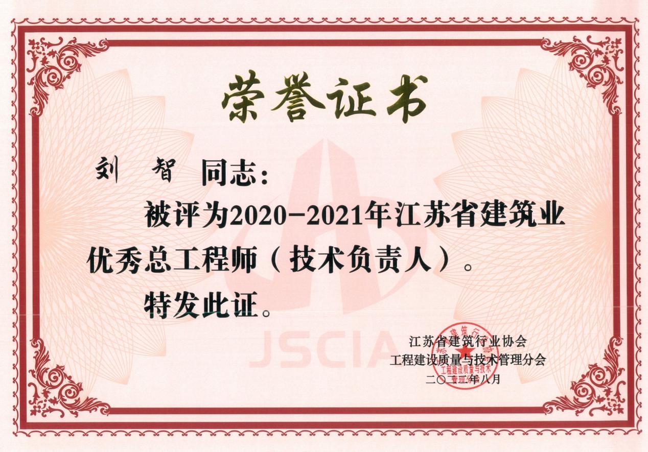 近日,由江苏省建筑行业协会《关于发布2020-2021年江苏省建筑业优秀总工程师(技术负责人)评价结果的通知》(苏建质协[2022]11号)获悉,江苏海建千亿官方网页版总工程师刘智同志被评为2020-2021年度江苏省建筑业优秀总工程师。据悉,连云港市共有五人获得该荣誉。