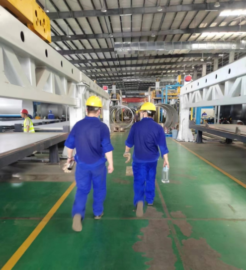 躲过烈日炙烤,室内作业也并不轻松。严格的劳动防护用品穿戴要求以及大功率压机的长时间运转,加上车间温度高、湿度大,室内就犹如大蒸笼。钻到筒体内焊接打磨的工人们,需要在里面工作数个小时,一滴滴汗水不断从脸颊、脖子、后背划过,这样的“蒸桑拿”式体验,是车间工人的家常便饭。