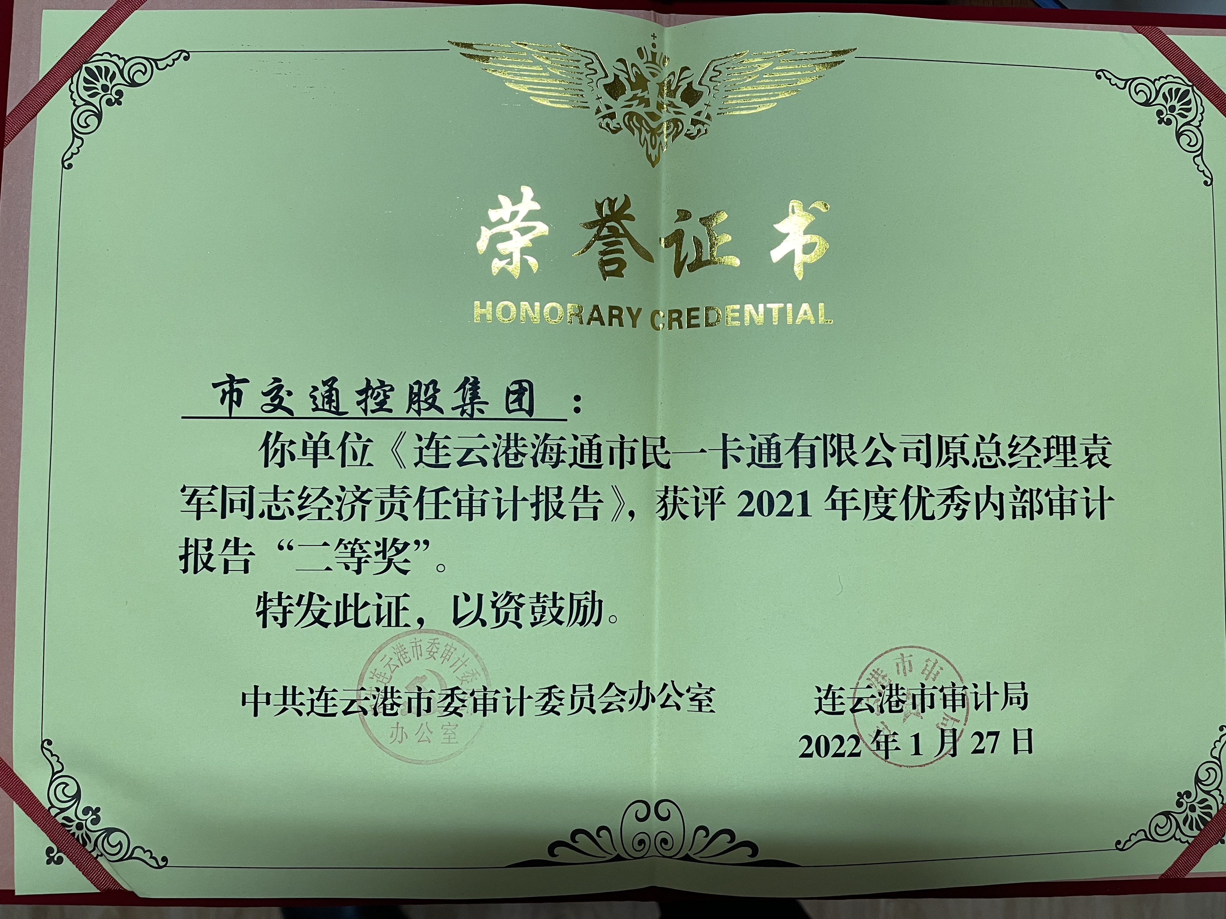 近日,千亿(中国)有限千亿官方网页版审计部出具的审计报告——《连云港海通市民一卡通有限千亿官方网页版原总经理袁军同志经济责任审计报告》,在审计局组织有关人员对2021年度全市内部审计报告开展评选工作中获得连云港市委审计委员会和连云港市审计局共同颁发的2021年度优秀内部审计报告“二等奖”。