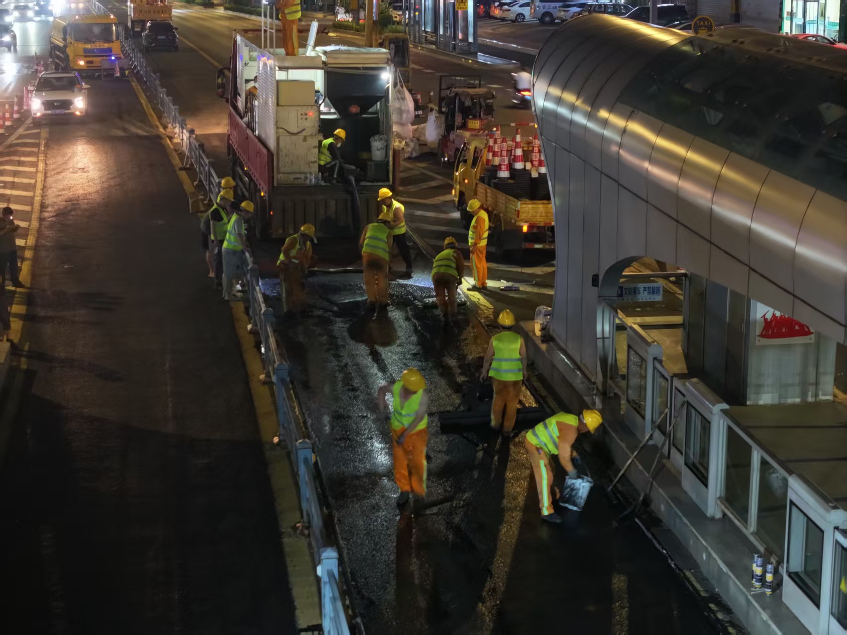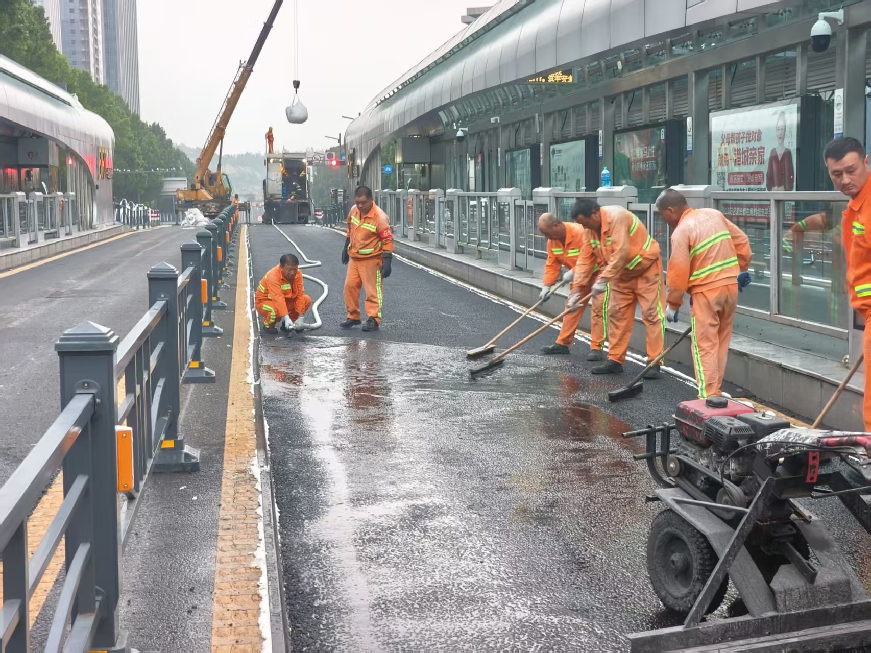 在港城BRT公交站台专用车道养护项目中,董入龙创新工作室再次扛起“创新大旗”。千亿官方网页版管养的84个BRT公交站台60米范围专用车道,因客流量大、车辆停靠频繁,路面车辙病害严重,传统养护难以兼顾效率与质量。工作室成员共同研判后,选取人流密集的一四九站、墟沟购物中心站及西园路站作为试点,引入“灌注式半柔性路面技术”。为确保技术落地,董入龙带领团队开展20余次模拟试验,精准把控材料摊铺厚度、压实温度等核心参数;施工期间,他创新采用“分段作业 + 错峰施工”模式,协调公交部门调整临时停靠点,最终仅用72小时便完成3个站台专用车道的病害整治。经后期跟踪观测,试点路段路面平整度、抗滑性能均达到优质标准。