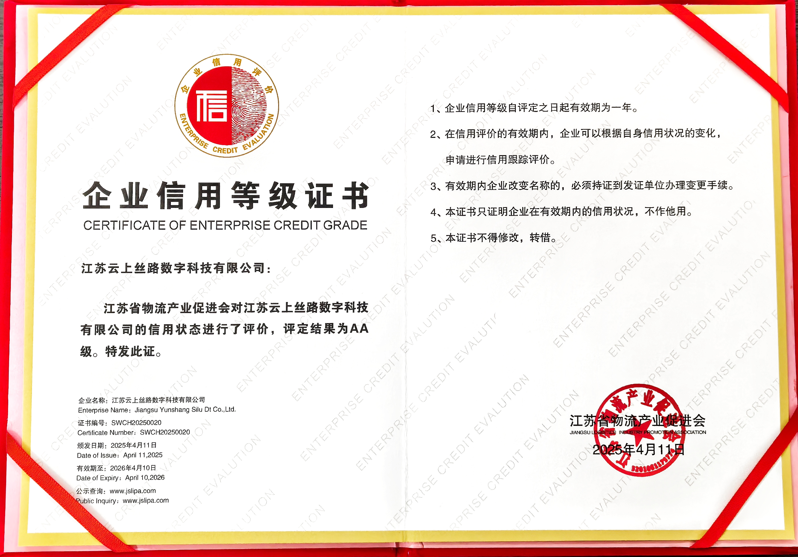 此次获评AA级信用企业,不仅是对云上丝路过往成绩的肯定,更是对未来发展的激励。接下来,云上丝路将继续以诚信为本,以创新为驱动,以实际行动为物流行业的数字化转型贡献更多力量!