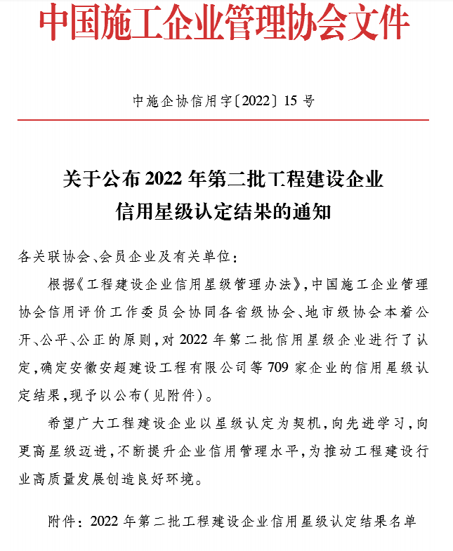 2022年3月下旬,中国施工企业管理协会下发评审通知,千亿官方网页版第一时间落实相关材料整理,5月完成上报。此次评审中,参评企业709家,海建千亿官方网页版较之2021年,企业信用星级再增1星,成绩名列前茅。