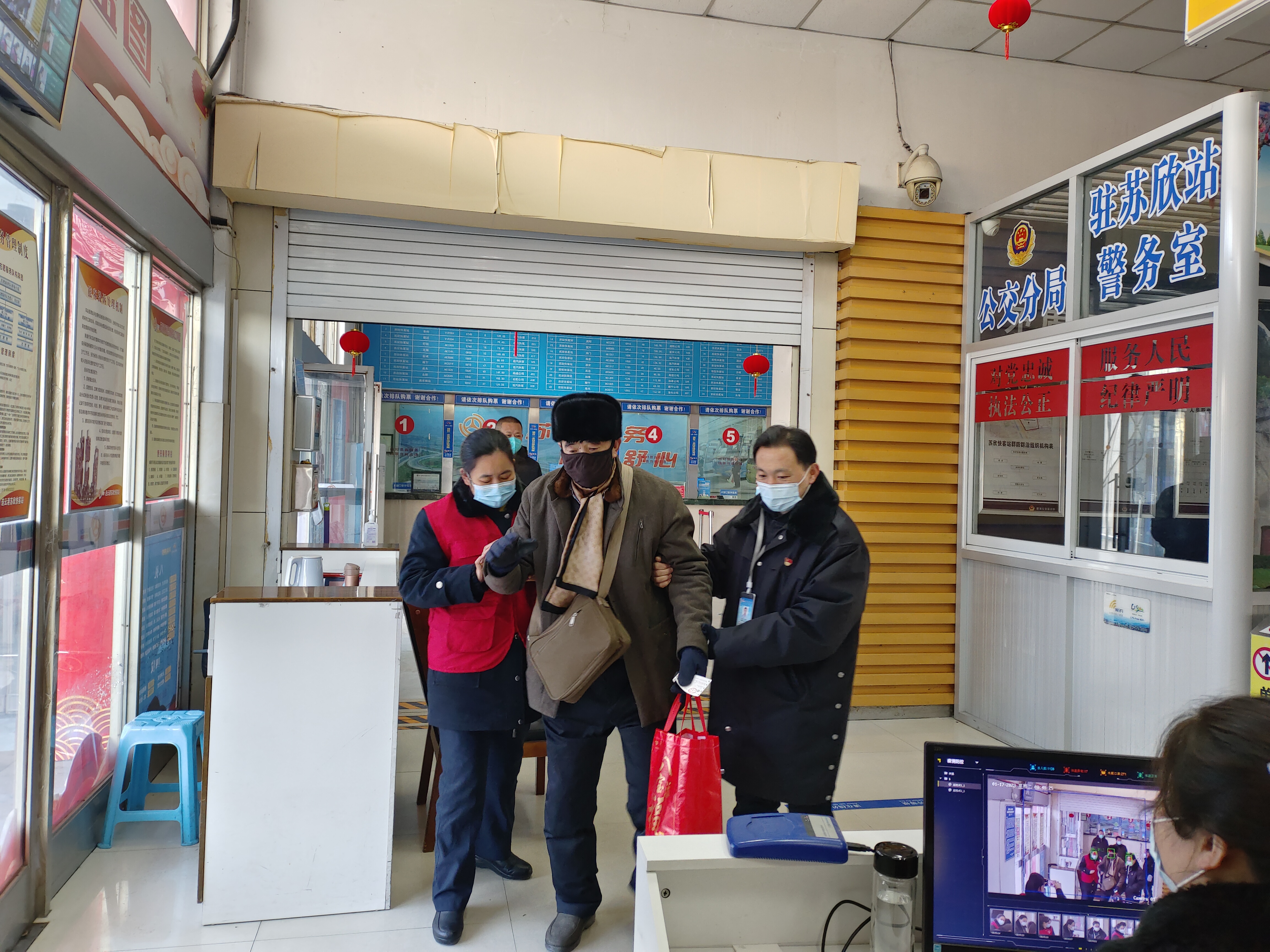 1月17日上午,连汽苏欣站客运员寇静在车站巡视时,发现有一位老人靠在车站门上,无法正常行走。寇静赶紧上前询问并提供帮助,经了解得知,老人患有颈椎病,容易头晕,不能长时间站立或走动。寇静立即搬来座椅让老人坐下,帮忙扶住老人,让老人头靠在椅子后面让他的颈椎有依靠缓解头晕,因为老人浑身无力冒虚汗,寇静及时拿出抽纸给老人擦汗。然后询问老人乘车信息并帮助取票,同时安排老人在候车区休息。检票后,寇静搀扶老人通过绿色通道进站乘车,并与同事王海江一起将老人扶到座椅上。与司机做好沟通,途中注意老人状况,到站后将老人亲手送到家属身边。