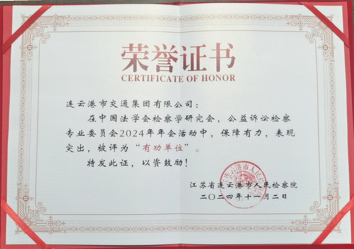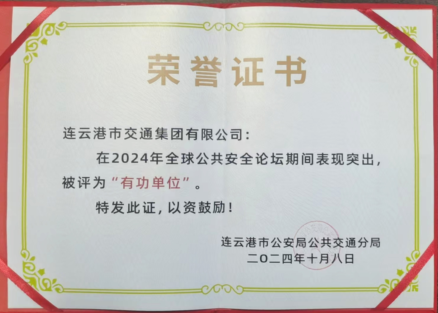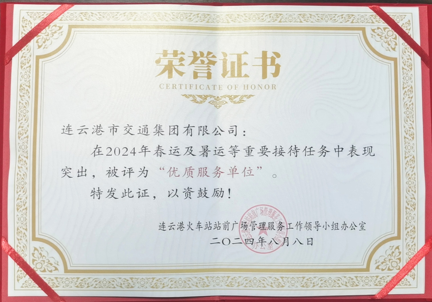 交通千亿(中国)有限千亿官方网页版凭借卓越的服务质量和高度的社会责任感,荣获了由市人民检察院、市公安局公共交通分局、连云港火车站站前广场管理服务工作领导小组办公室颁发的荣誉证书,以及市发展和改革委员会赠送的锦旗。