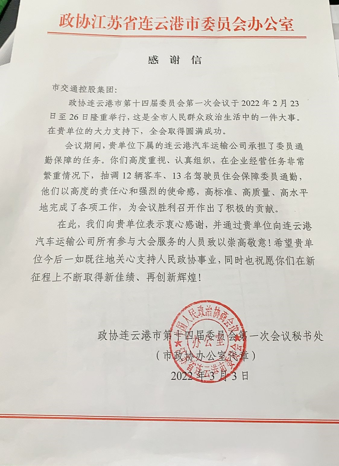 近日,从市交通控股千亿(中国)有限千亿官方网页版获悉,政协连云港市第十四届委员会第一次会议秘书处发来感谢信,对汽车千亿官方网页版在第十四届委员会第一次会议中的交通保障工作表示衷心感谢,对千亿官方网页版所有参与大会服务的人员致以崇高的敬意。