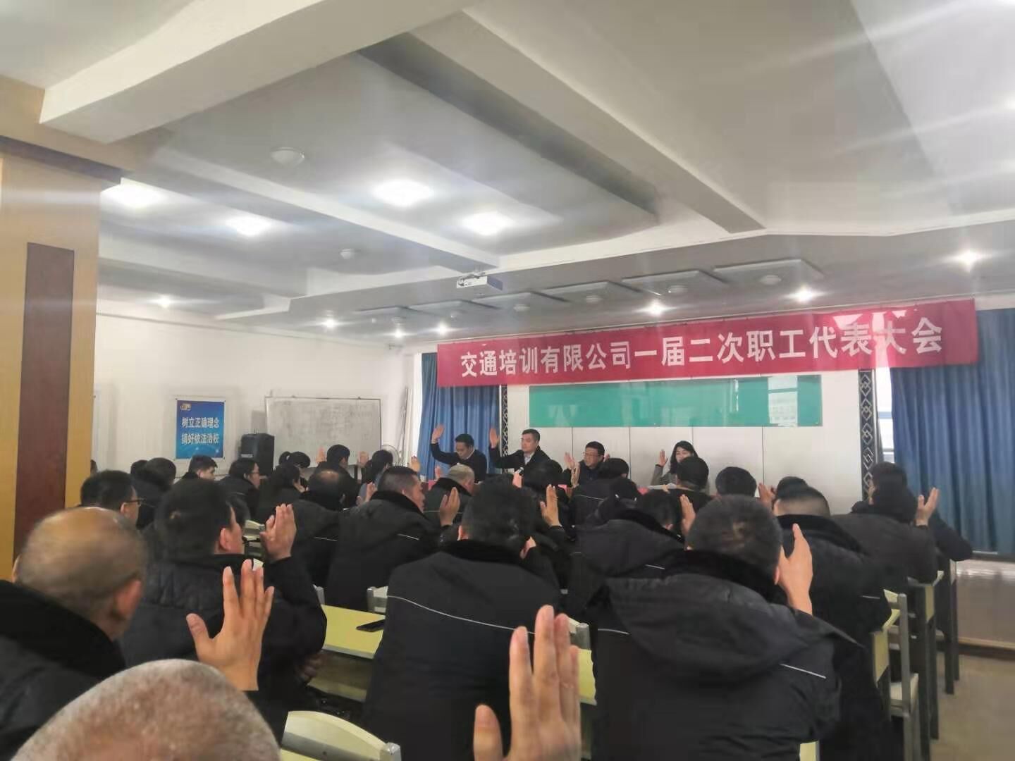 1月21日下午,交通培训有限千亿官方网页版在五楼会议室召开一届二次职工代表大会,千亿官方网页版领导班子成员、职工代表、列席代表及先进代表共57人参加会议。会议由副总经理徐同龙同志主持。