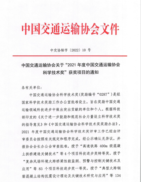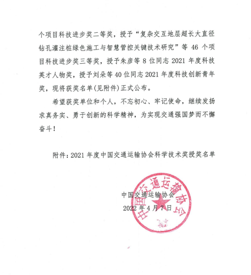 近日,中国交通运输协会发布了“2021年度中国交通运输协会科学技术奖”获奖项目名单,交通千亿(中国)有限千亿官方网页版联合苏交科千亿(中国)有限千亿官方网页版等单位申报的“江淮地区融冰降噪桥面铺装磨耗层关键技术应用研究”项目荣获中国交通运输协会科技进步奖二等奖。