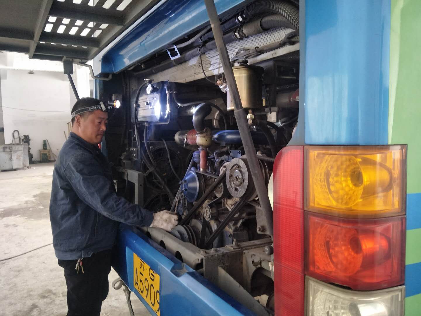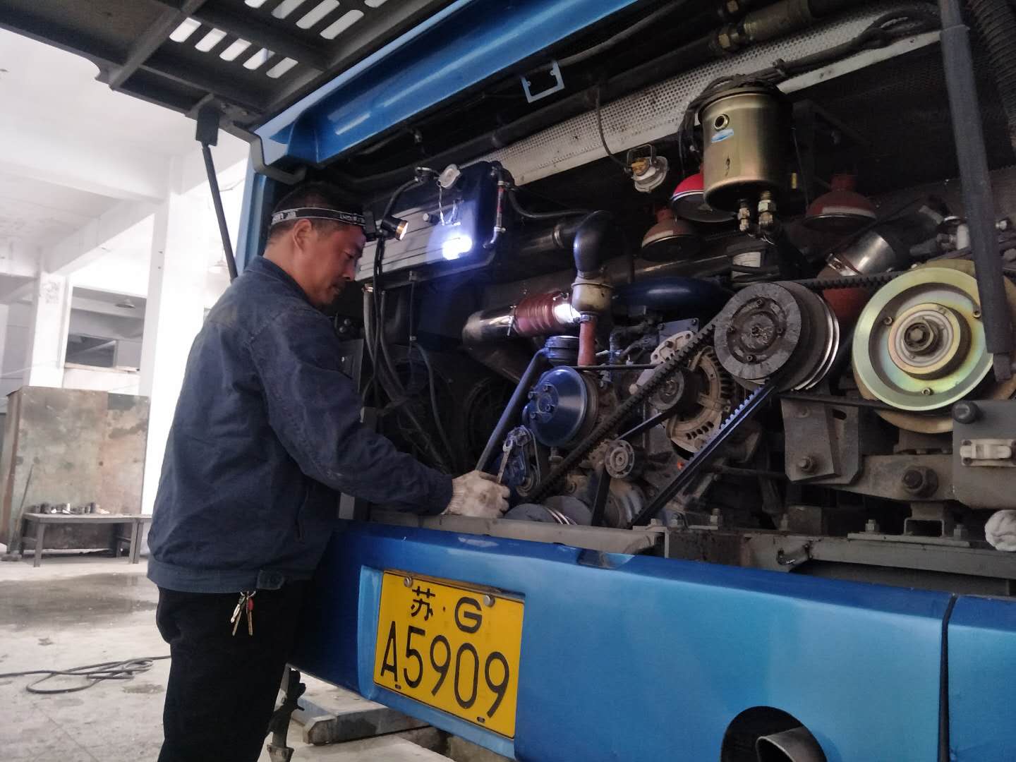 地沟只有几十厘米宽,半人高,而且光线很暗,刘长伦佝偻着身子,带着工作灯,钻了进去,为了吊变速器,修离合器,他得常常半蹲在一块板上,弯着腰,将上半身探进车底维修、保养车辆,短暂地结束工作从地沟钻出来时,手上、身上已经满是机油和污垢。对于这样的状态,刘长伦习以为常,他每天进入车间的维修车辆有40台次左右,每个月至少需给七八十辆公交车做二级保养,修理工每天6:30上班,20:30下班,如果遇到紧急维修任务,还得加班加点。炎热的夏季更加难熬,地沟又闷又热,一天下来,每个人沾满油渍的衣服、头发都是湿了又干、干了又湿。遇上修发动机这样的活,为了避免带入杂物,也不能带手套,周边都是金属部件,不小心磕了碰了,在所难免,每个修理工的手上、胳膊上都有工作造成的划伤。