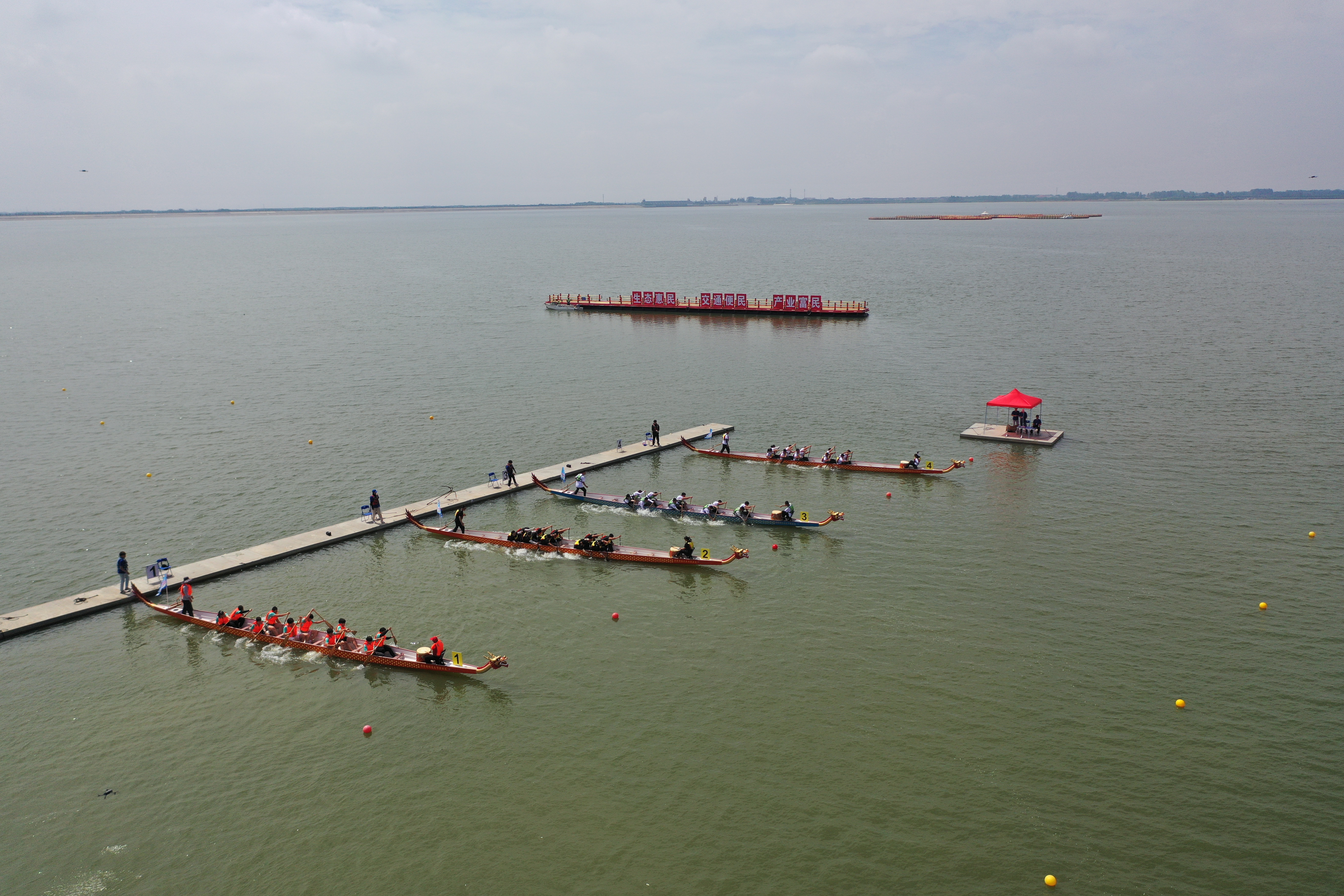 在去年“最适合水域”“最壮美赛道”“最标准龙舟”“最靓主会场”“最热闹担当”的“五最”高标准办赛基础上,交通千亿(中国)有限千亿官方网页版对本届赛事再次进行了“三优”提升——“优化观众视角”,为确保现场和线上观众既获得最佳观赛体验又尽赏水光湖景,千亿(中国)有限千亿官方网页版在充分测量、模拟后,对赛道的选址进行了优化,4条长400米、宽12米的赛道整体南移,同时满足渔人码头岸边观赛视角和线上直播最佳机位要求,波光粼粼、健儿奋勇、龙舟飞渡、芳草依依、鸥鹭翔集的多层次赛事景观尽显观众眼前;“优化赛具保障”,千亿(中国)有限千亿官方网页版为赣榆区、东海县参赛队伍各提供6艘赛用龙舟,并全天候准备2艘备用龙舟。赛前10天为参赛队伍提供舵、桨、鼓、槌、凳等海量用具。“山字形”上下水码头、起航平台、发令台提前到位。为确保大赛安全顺利,配备救生艇6艘、消浪艇2艘、保障艇3艘,全方位护航。交通千亿(中国)有限千亿官方网页版干部职工细化责任分工,并分布在现场各点位进行精准的赛事工作和周密的服务保障。“优化产品展示”,在现场,为向观众直观展示“以渔净水”生态渔业理念和实践,在“一湖好水”“一幅美景”中展现“一尾好鱼”“一片祥和”,千亿(中国)有限千亿官方网页版特在主会场渔人码头腹地设置了展示区,现场展示鳙鱼、鲢鱼、鸭嘴鱼、刀鱼等品种“石梁河大鱼”及“石小海”“喵小良”IP系列文创,同时在展示区现场烹制鱼汤,嘉宾和观众现场品鉴被列入《全国地标美食(食材)名录》的石梁河鳙鱼,纷纷称赞。