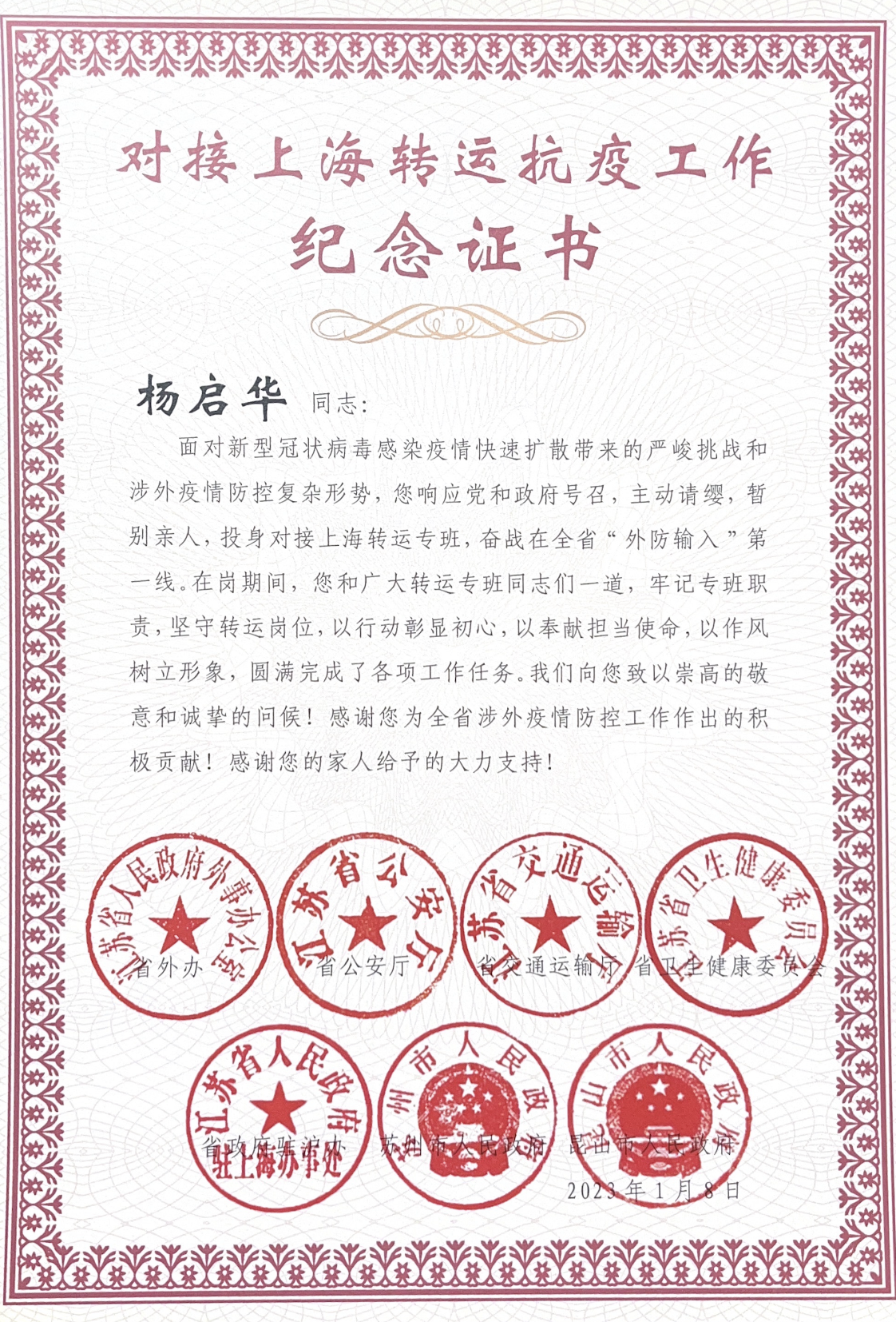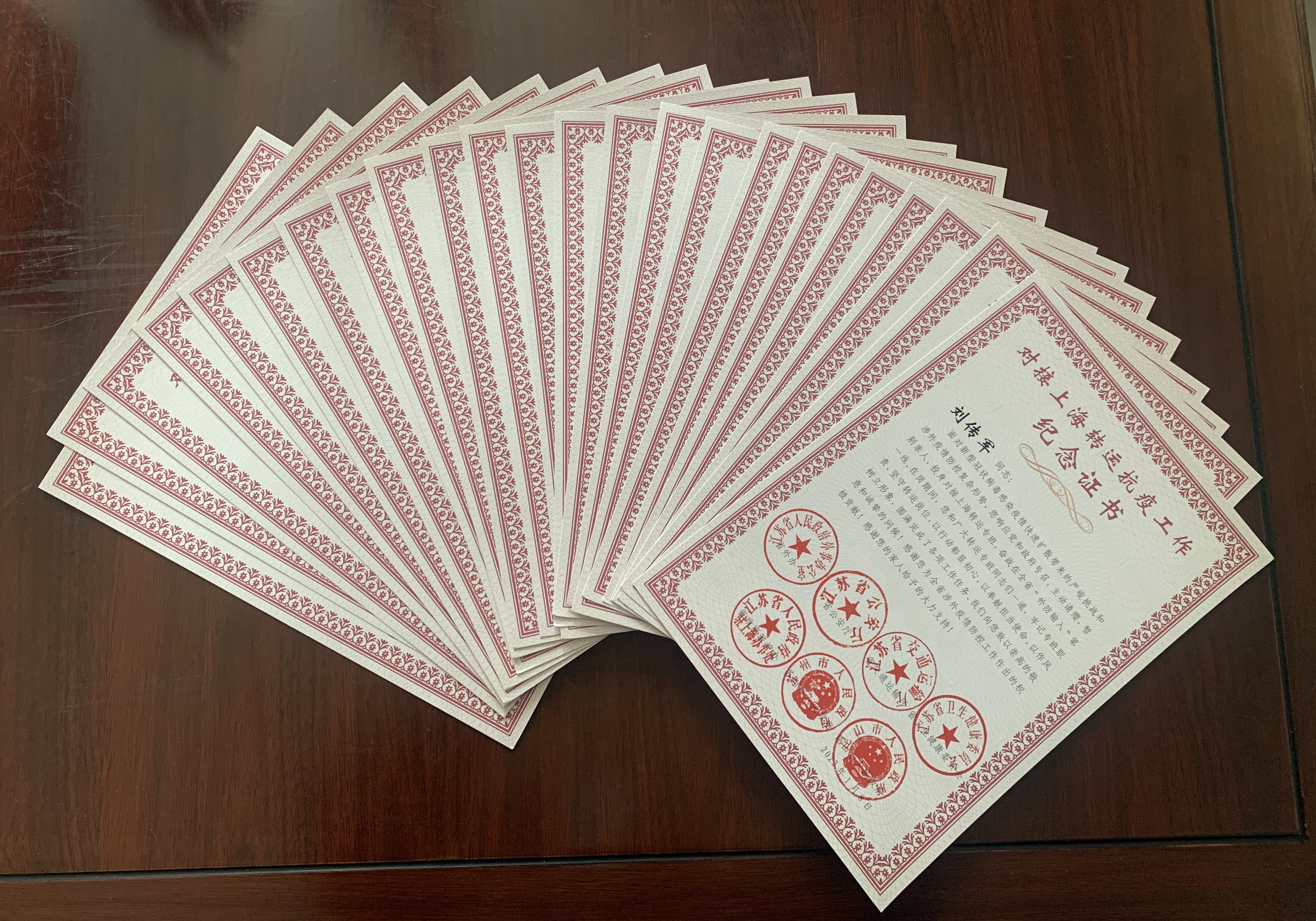 近日,汽车千亿官方网页版收到由省外办、省公安厅、省交通运输厅、省卫生健康委员会、省政府驻泸办、苏州市人民政府、昆山市人民政府共同颁发的44份对接上海转运抗疫工作纪念证书,向支援疫情防控工作的集体和个人表示了诚挚的谢意。