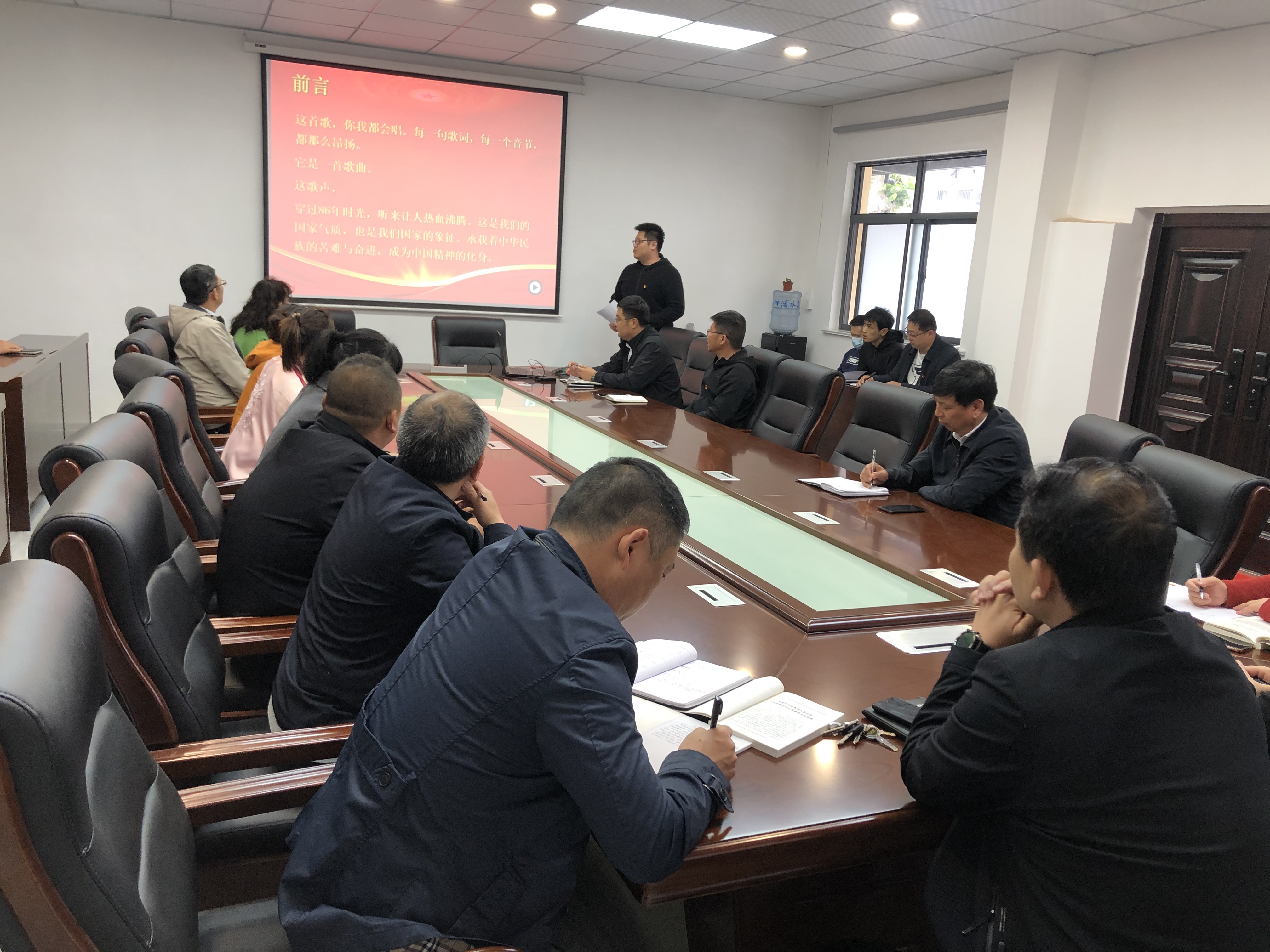 王首鉴同志首先带领大家一同品味那首穿过86年时光,听起来让人热血沸腾的歌曲《义勇军进行曲》,详细介绍了国歌从创作至今的辛路历程,生动的引入国歌的词作者田汉、曲作者聂耳这两位堪称黄金搭档的生平简介,并回顾中国人民从站起来到富起来、再到强起来的伟大飞跃历程,从红色的岁月和一个个红色的传奇中汲取力量、勇气。最后,全体与会人员起立歌唱《义勇军进行曲》,深情嘹亮的歌声把主题党日活动推向高潮。