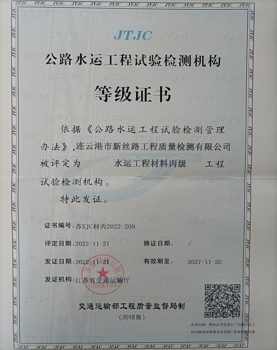 近日,江苏海建新丝路检测千亿官方网页版水运工程材料试验检测资质,经江苏省交通运输厅核准,申报成功并取得证书。