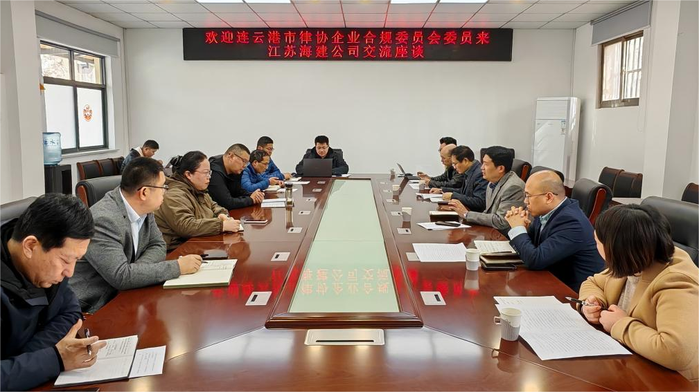 近日,连云港市律师协会合规委员会受邀到江苏海建千亿官方网页版参加企业合规交流座谈会,合规委员会会长刘华国同5名委员参加本次座谈会。千亿官方网页版副总经理邵巍、千亿官方网页版市场部、人力部、安监部、财务部、工程部、合约部部门负责人与会并进行交流讨论。