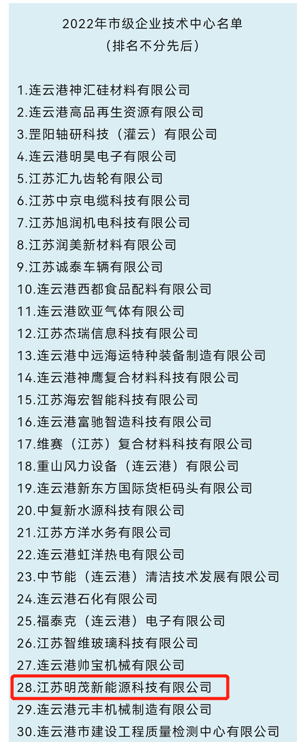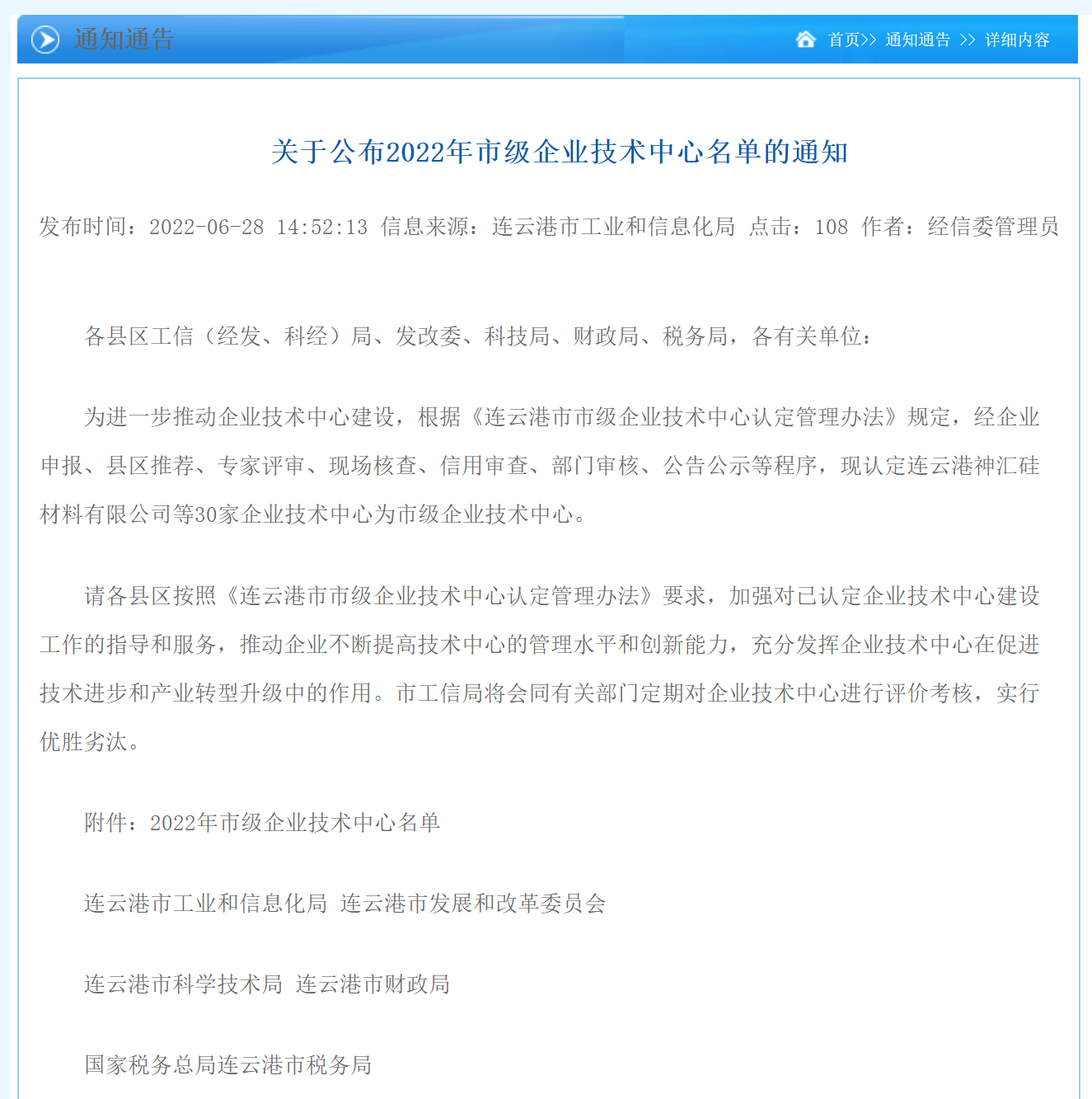6月28日,连云港市工业和信息化局在官方网站发文,根据《连云港市认定企业技术中心管理办法》,认定明茂千亿官方网页版为2022年连云港市企业技术中心。