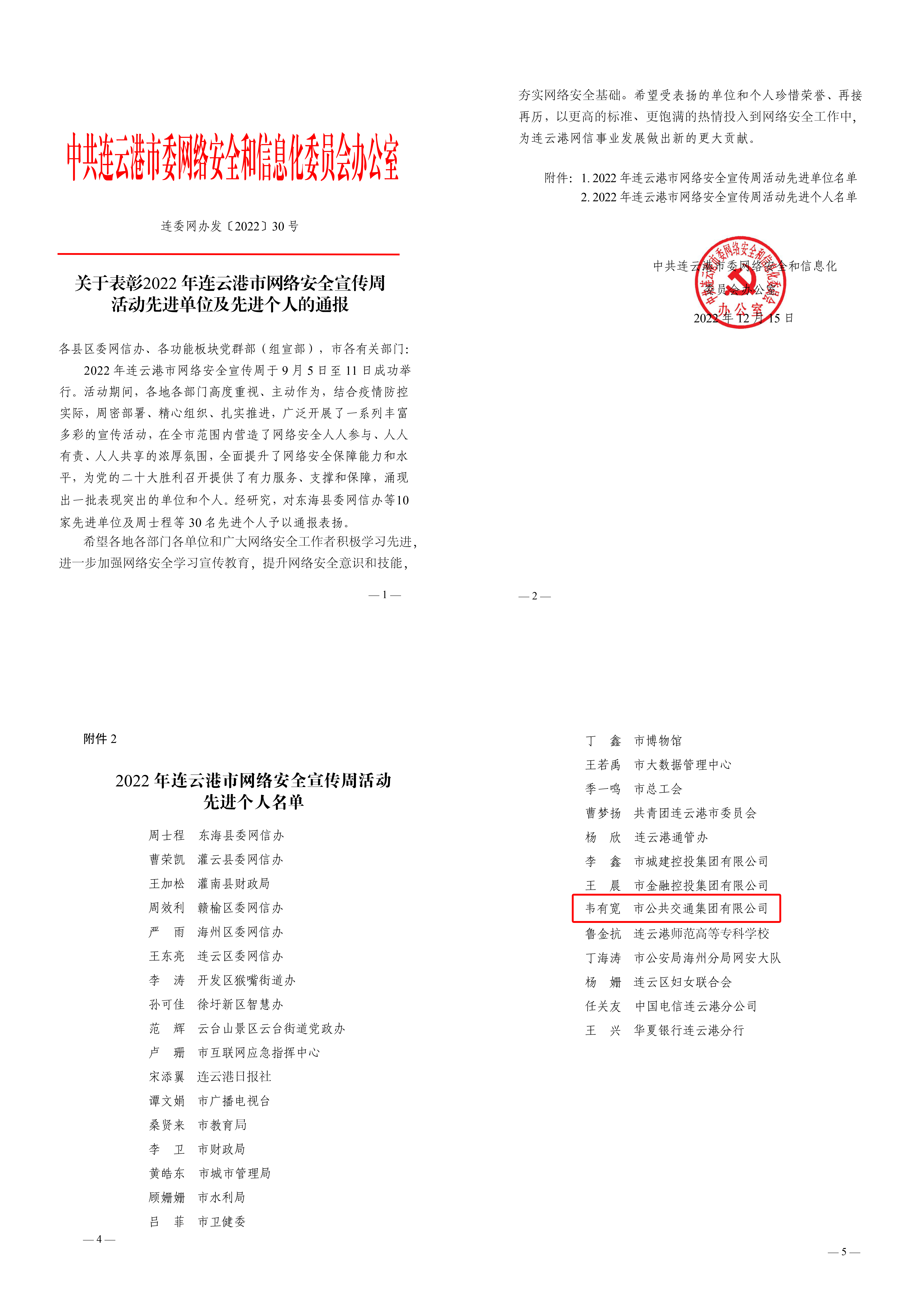 2022年连云港市网络安全宣传周于9月5日至11日成功举行。活动期间,市交通控股千亿(中国)有限千亿官方网页版权属公交千亿(中国)有限千亿官方网页版高度重视,主动作为,广泛开展宣传活动,营造网络安全人人参与、人人有责、人人共享的浓厚氛围。公交千亿(中国)有限千亿官方网页版生产运营部韦有宽在宣传活动中表现突出,获得连云港市网络安全宣传周活动先进个人荣誉称号。