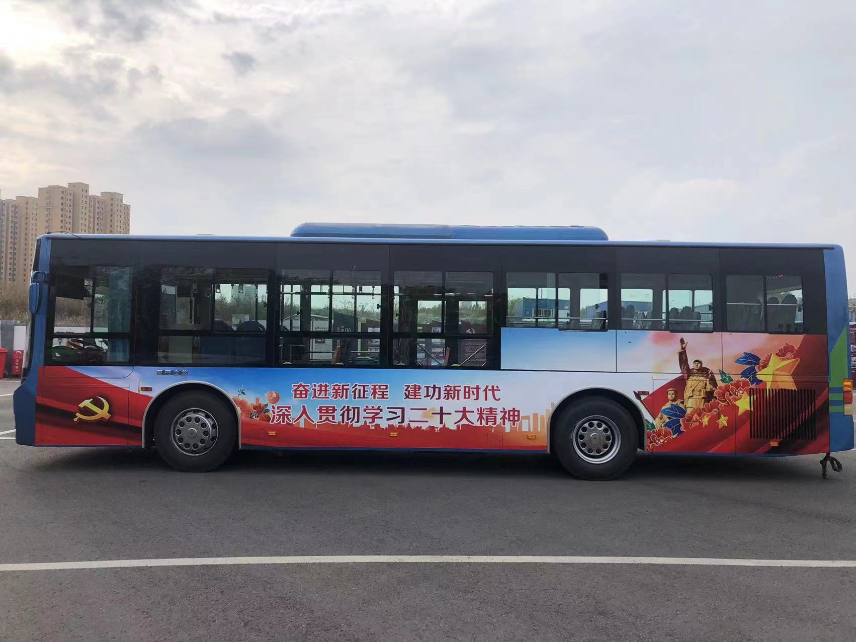车身外观,更新为以红、蓝色为主基调,车身喷绘上“深入贯彻学习二十大精神”“奋进新征程 建功新时代”等醒目的标语,通过车辆每日运行的方式穿梭于城市的大街小巷,增强社会宣传受众面,让党的理论“坐”上公交,走向社会。