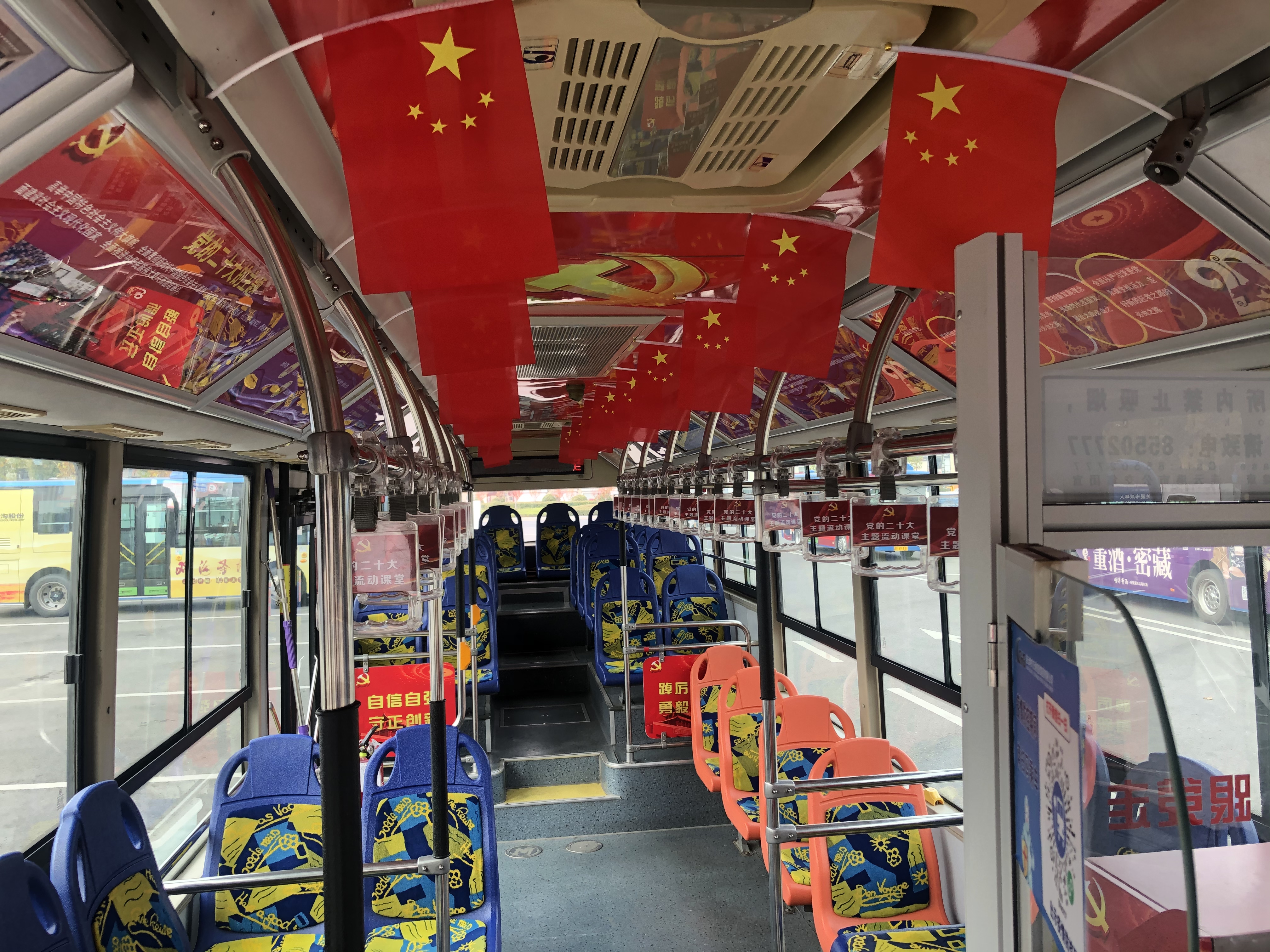 在暨2021年建党百年“红色党史”主题车厢的基础上,今年公交事业一部党支部紧紧围绕党的二十大为宣传主线,充分结合当前工作实际,在持续深化党史学习教育的同时,以公交20路为红色宣传载体再发力,分别将车身广告及车内展板进行更新升级,以党的二十大报告为主要宣传内容,打造了主题会议型车厢。