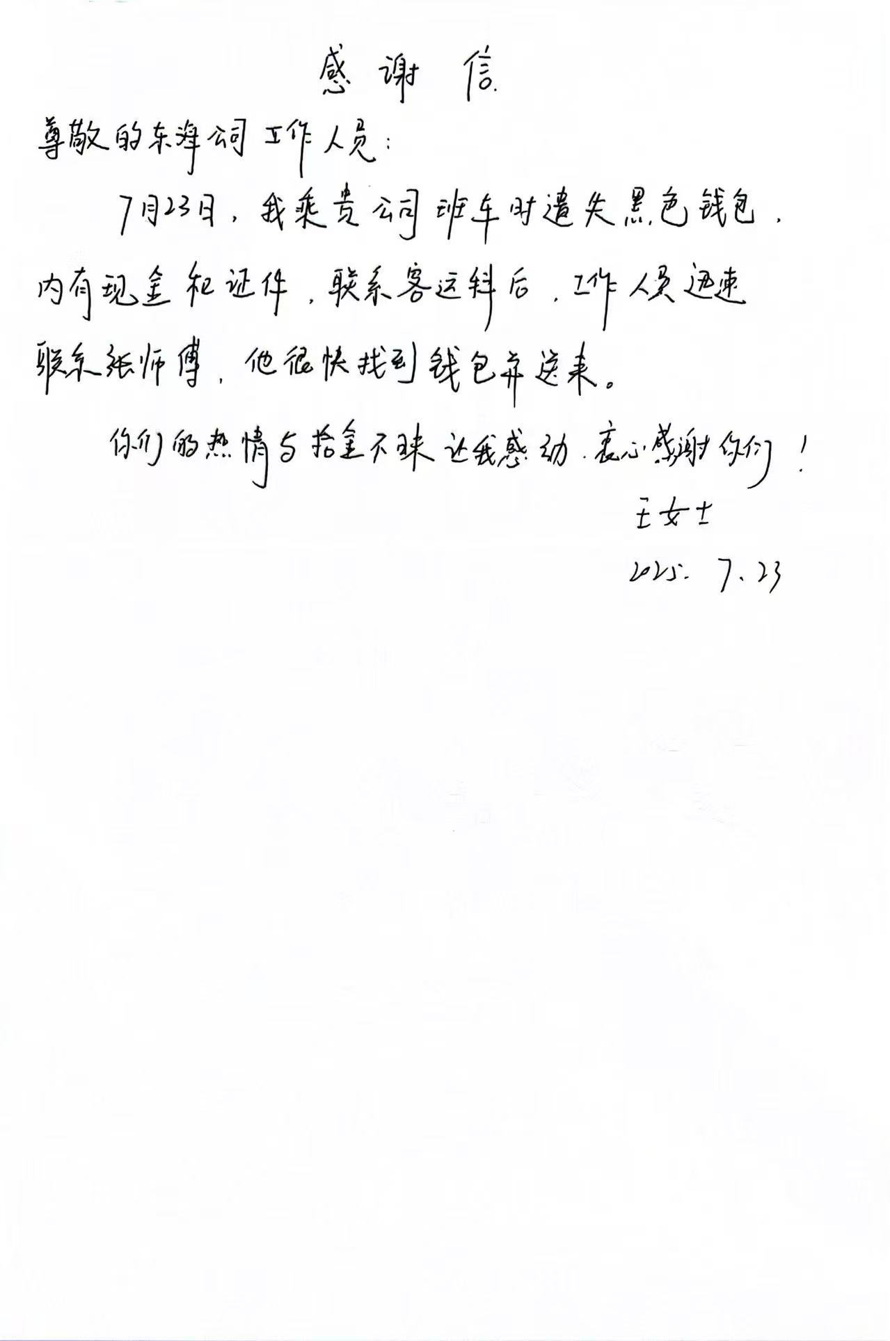 事后,王女士特意写下感谢信,感慨钱包里面的现金、证件一样没少,再三感谢张师傅及工作人员。张师傅拾金不昧的行为,不仅展现了他个人高尚的道德品质,也彰显了我千亿官方网页版员工良好的职业素养,温暖了乘客的心。