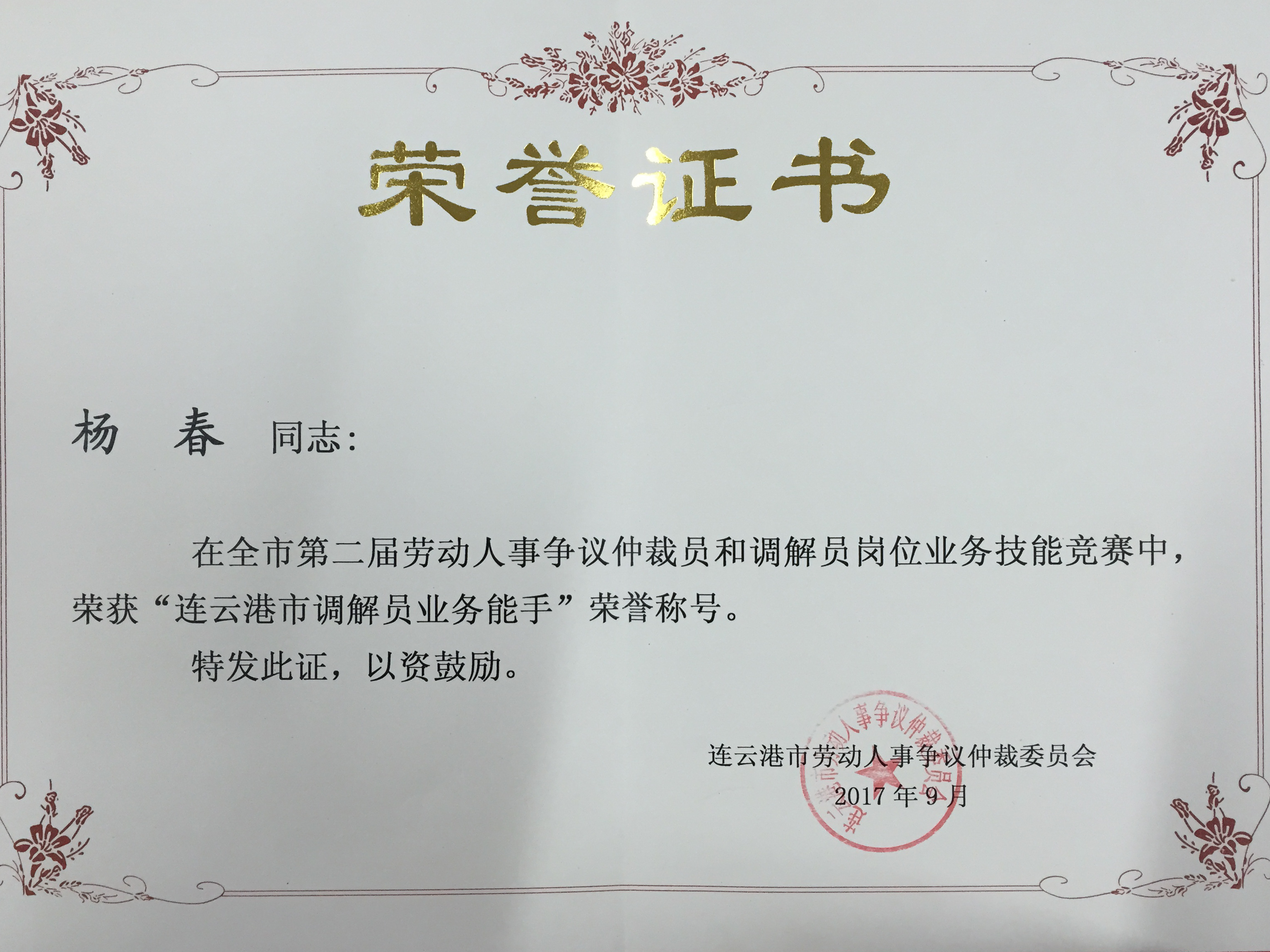 9月,航运千亿官方网页版杨春同志在连云港市第二届劳动人事争议仲裁员和调解员岗位业务技能竞赛中获得“连云港市调解员业务能手”荣誉称号。该项技能竞赛由市人力资源和社会保障局、市总工会、市劳动人事争议仲裁委员会共同组织举办,共50多名选手参加第二届劳动人事争议仲裁员和调解员岗位业务技能竞赛。经过笔试和面试的综合成绩评选,前十名的仲裁员和调解员获得荣誉证书。竞赛以促进我市和谐劳动关系的构建为出发点,鼓励广大人力资源工作从业者、工会工作者,积极主动学习相关劳动法律法规,不断提高职业素养和业务水平。