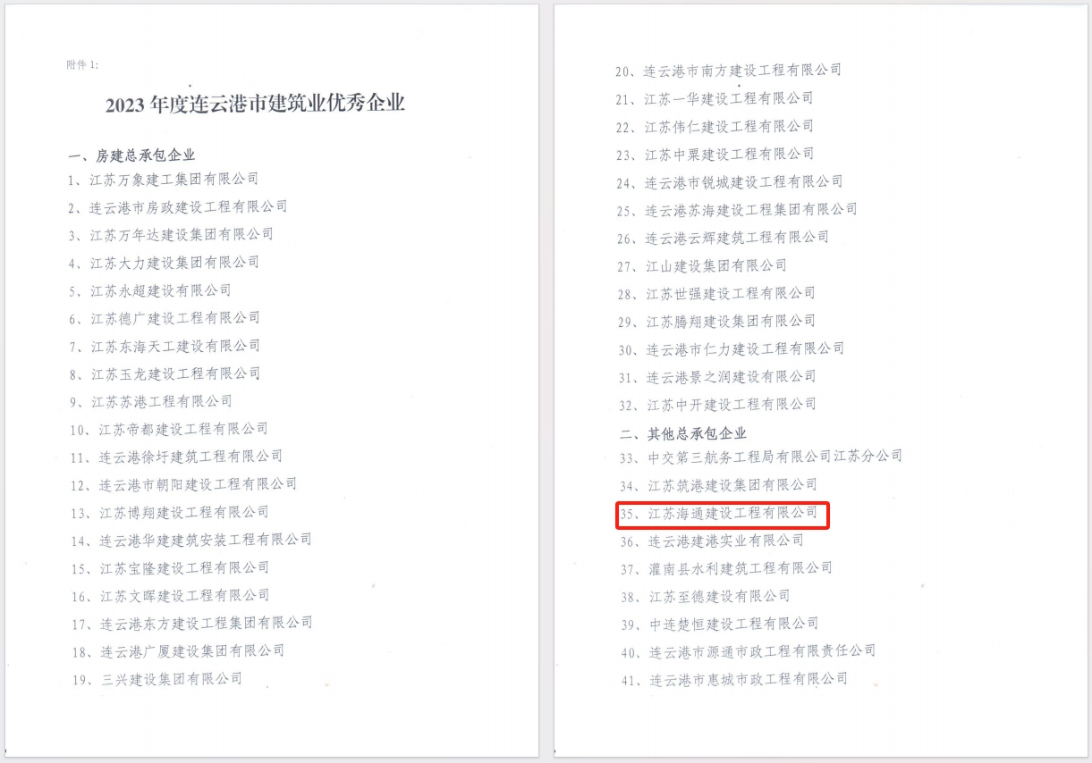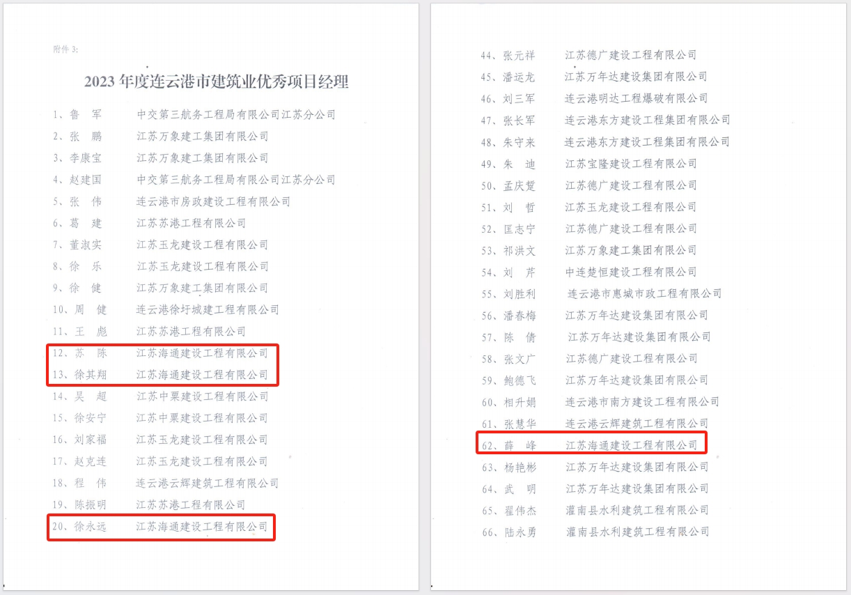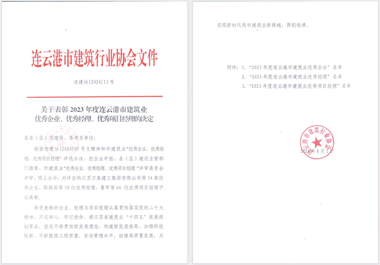近日,从连云港市建筑业协会获悉,海建千亿官方网页版获评“2023年度连云港市建筑业优秀企业”,同时,海建千亿官方网页版党委书记、董事长于振国获评“2023年度连云港市建筑业优秀经理”,徐其翔、薛峰、徐永远、苏陈获评“2023年度连云港市建筑业优秀项目经理”。