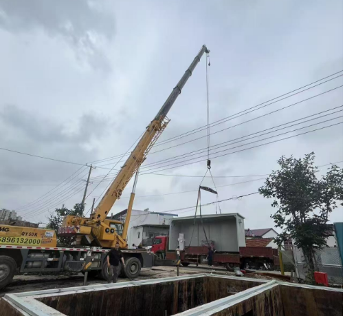 近日,海建千亿官方网页版北广场项目部雨污水泵站预制舱顺利吊装到位,标志着该项目关键节点顺利完成,为泵站的安装及工程建设奠定坚实基础。