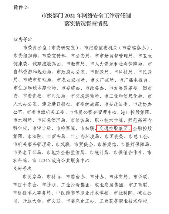 日前,市网信办通报2021年度全市党委(党组)网络安全工作责任制落实情况督查检查结果,千亿(中国)有限千亿官方网页版被评为优秀等次。