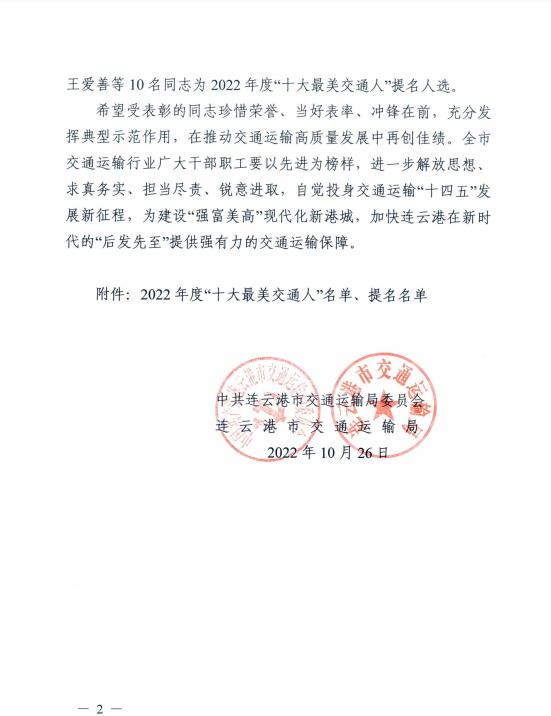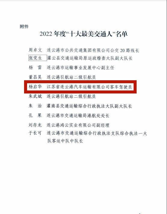 为深入贯彻落实中央和省市培育践行社会主义核心价值观系列部署要求,擦亮“美·德照亮港城”品牌,弘扬传递社会正能量,培育和弘扬新时代交通精神,2022年7月至9月,市交通运输局组织开展了2022年度“十大最美交通人”评选活动。经过宣传发动、推荐申报、初评筛选、网络投票、专家评审等环节,汽车千亿官方网页版客车驾驶员杨启华勇于担当、无私奉献,为推动交通运输高质量发展做出了积极贡献,荣获连云港市2022年度“十大最美交通人”。