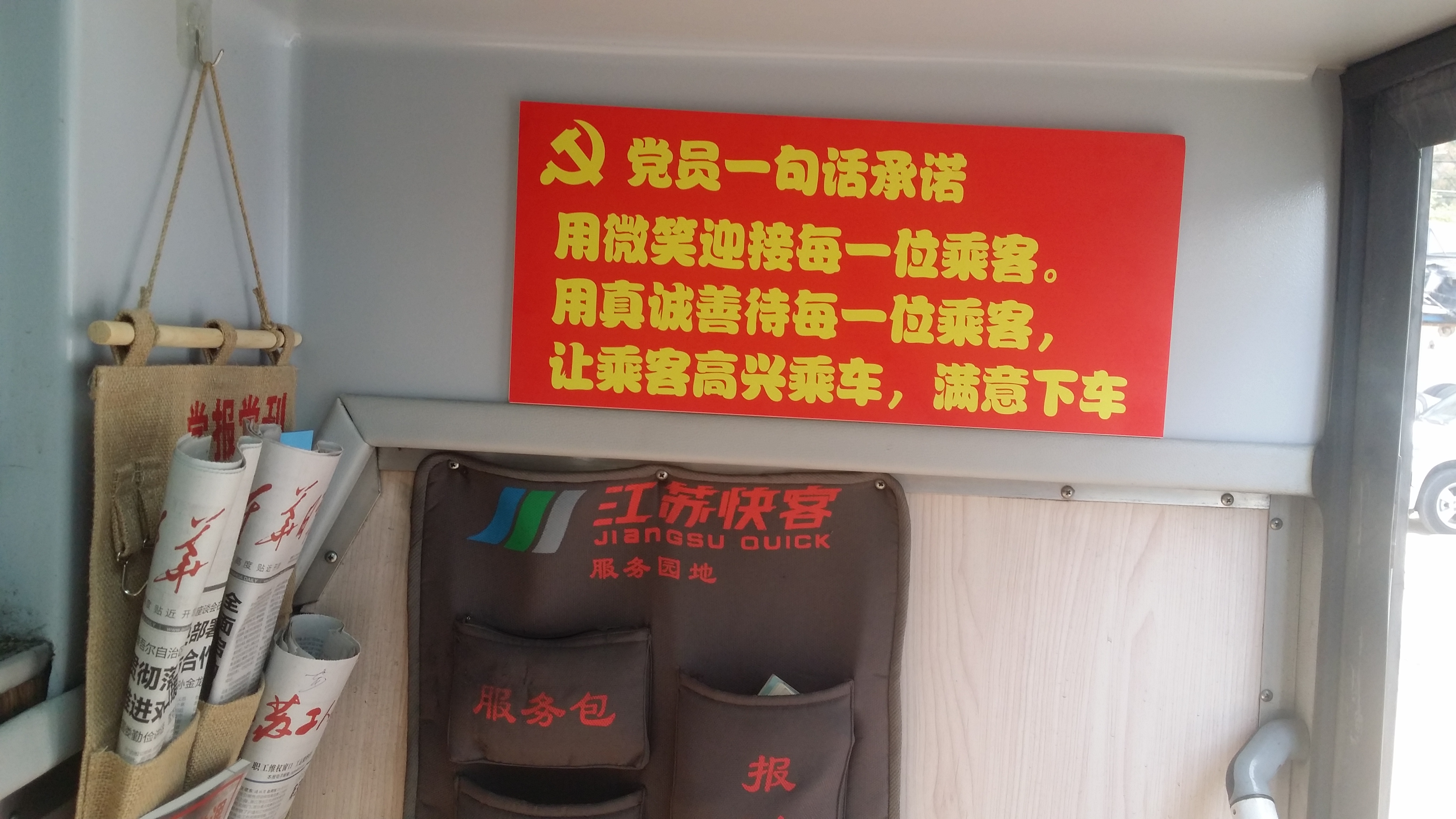 走进车厢内,映入眼帘的就是党员一句话承诺,紧接专门摆放书籍、报纸报刊展示袋上就是《十九大报告》、《社会主义核心价值观》、当天的报纸等内容一一展现在大家面前。整个车厢都变成了宣传党建知识的小阵地,散发着浓厚的党建文化氛围,让乘客领略到党建文化精髓,感受到十九大精神的实质内涵。