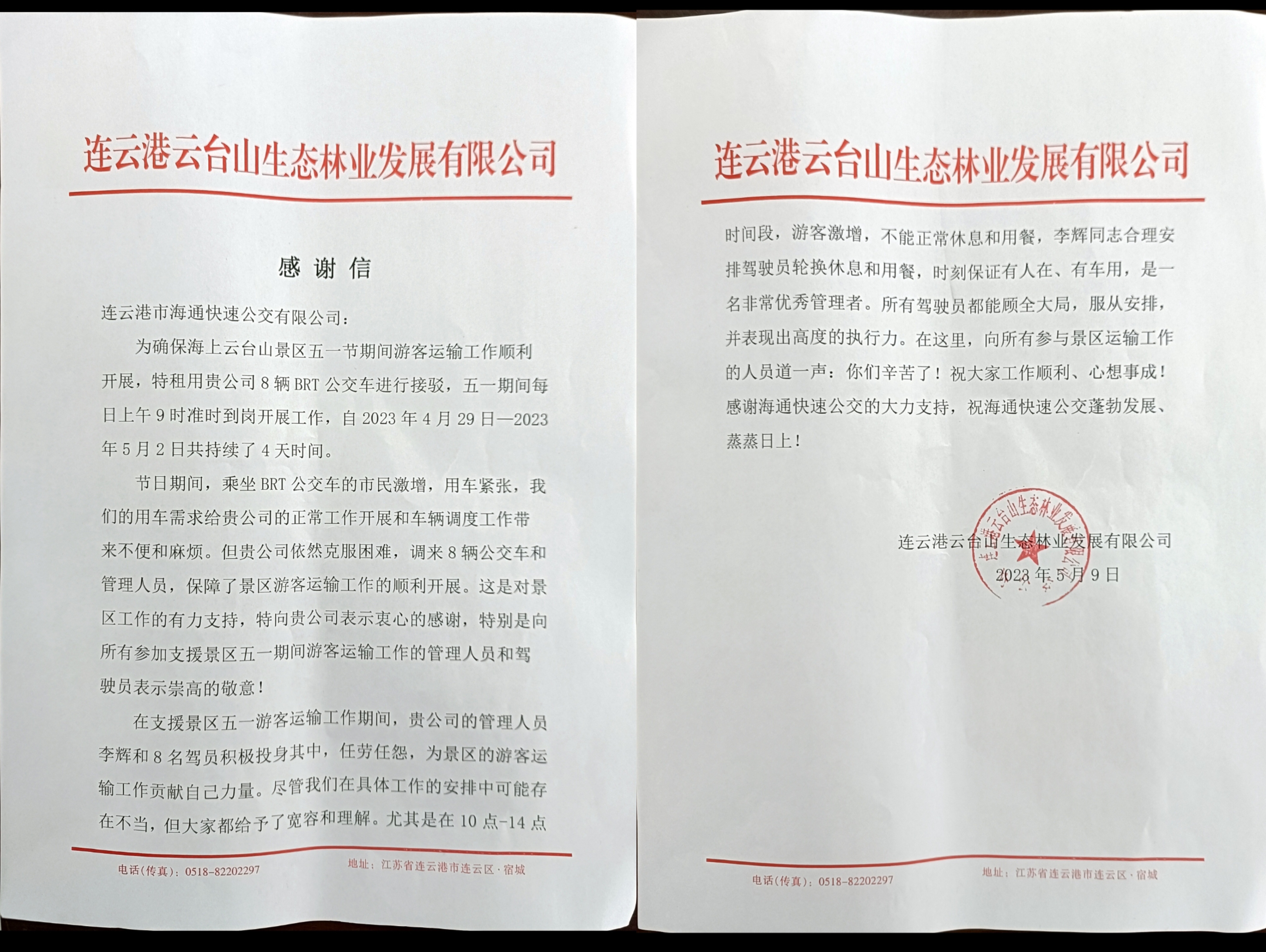 云台山景区的这封感谢信不仅拉近了景区和公交千亿(中国)有限千亿官方网页版之间的距离,也充分彰显了公交千亿(中国)有限千亿官方网页版的企业形象。在未来的工作中,公交千亿(中国)有限千亿官方网页版将继续秉承服务至上的原则,全力以赴为游客提供更优质的出行服务。