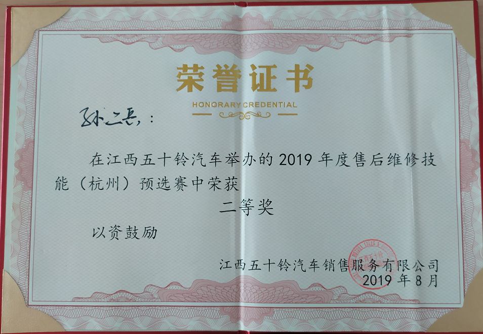 为进一步提高江西五十铃客户满意度,提升售后综合服务水平,8月13、14日两天,江西五十铃汽车销售服务有限千亿官方网页版在全国组织2019年售后维修技能大赛活动,修理千亿官方网页版孙二兵同志代表连云港地区选手参加了杭州段的预选赛。比赛中,孙二兵同志凭借着扎实的理论基础和熟练的操作技能,在激烈的比赛中获得个人二等奖的好成绩。