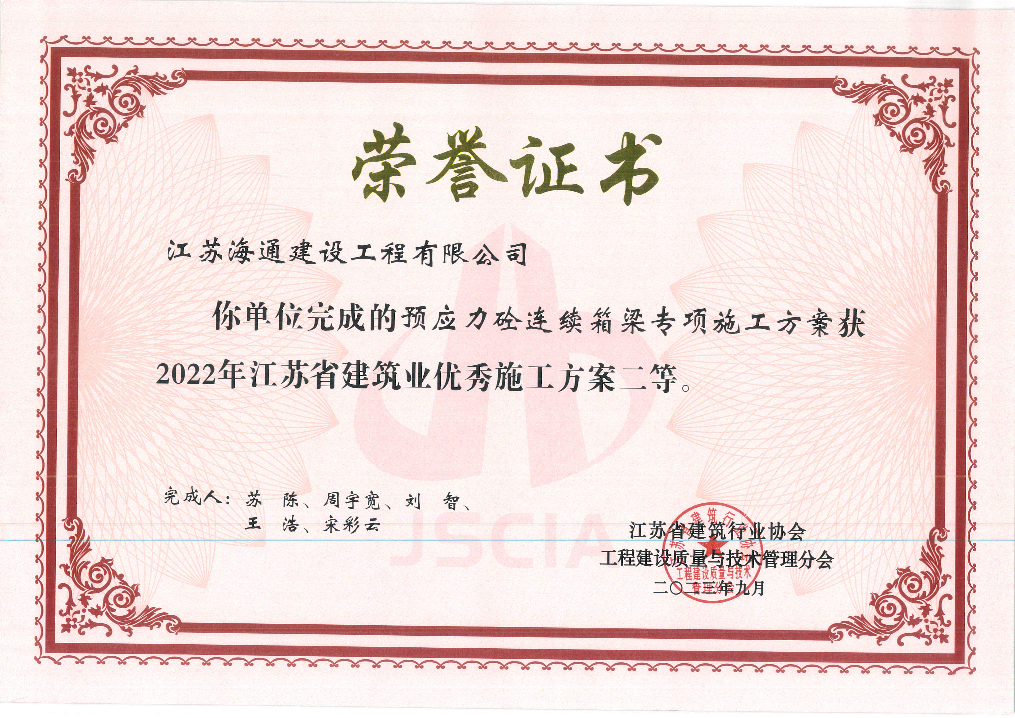 日前,从江苏省建筑业协会获悉,江苏海建千亿官方网页版申报的《预应力砼连续箱梁专项施工方案》和《二沉池、生物反应池基坑工程基坑支护工程土方开挖专项方案》两项施工方案分获江苏省建筑业优秀施工方案二等奖和三等奖。