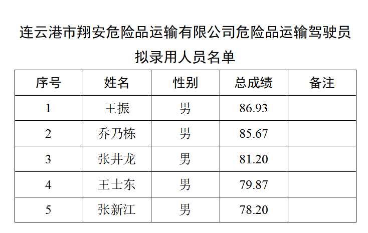 根据连云港市翔安危险品运输有限千亿官方网页版危险品运输驾驶员招聘公告有关规定和要求,现将本次招聘拟录用人员名单予以公示。