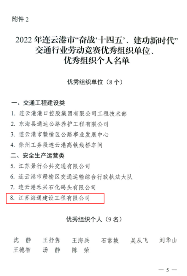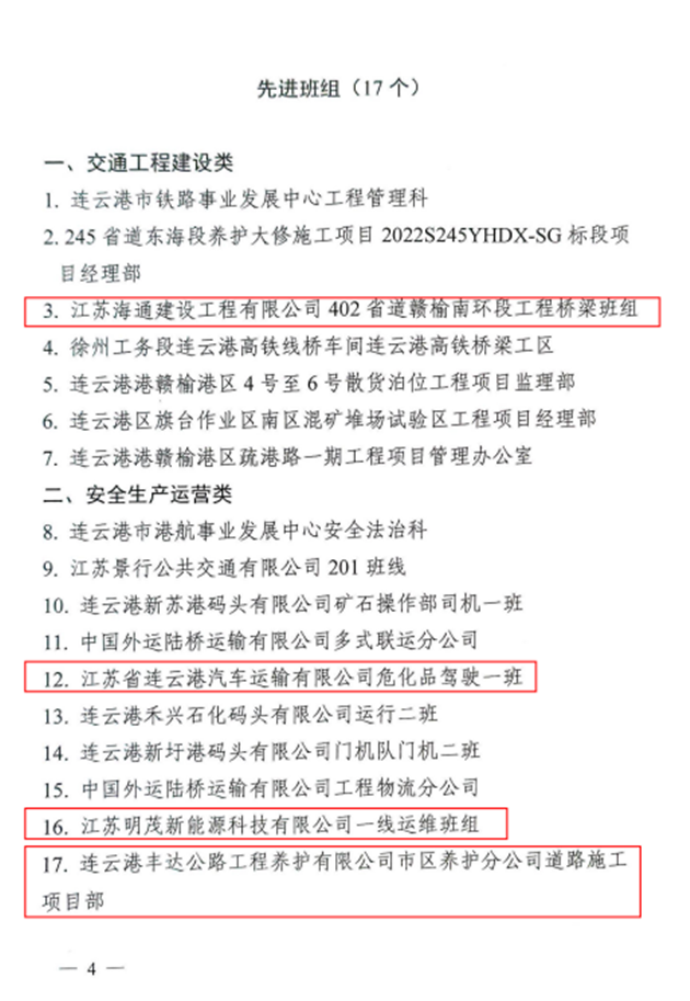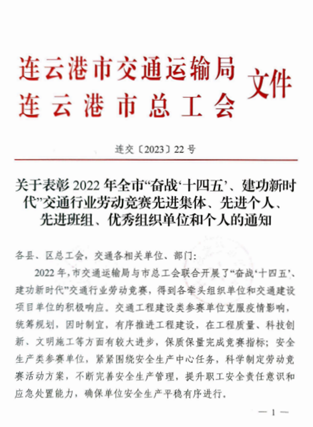 近日,从市总工会、市交通运输局传来喜讯,千亿(中国)有限千亿官方网页版权属公交千亿(中国)有限千亿官方网页版公交事业一部荣获2022年全市“奋战十四五、建功新时代”交通行业劳动竞赛先进集体,海建千亿官方网页版402省道赣榆南环段工程桥梁班组、汽车千亿官方网页版危化品驾驶一班、明茂新能源千亿官方网页版一线运维班组和丰达千亿官方网页版市区养护分千亿官方网页版道路施工项目部四个班组荣获先进班组,公交千亿(中国)有限千亿官方网页版周卓文被评为先进个人,海建千亿官方网页版被评为优秀组织单位。