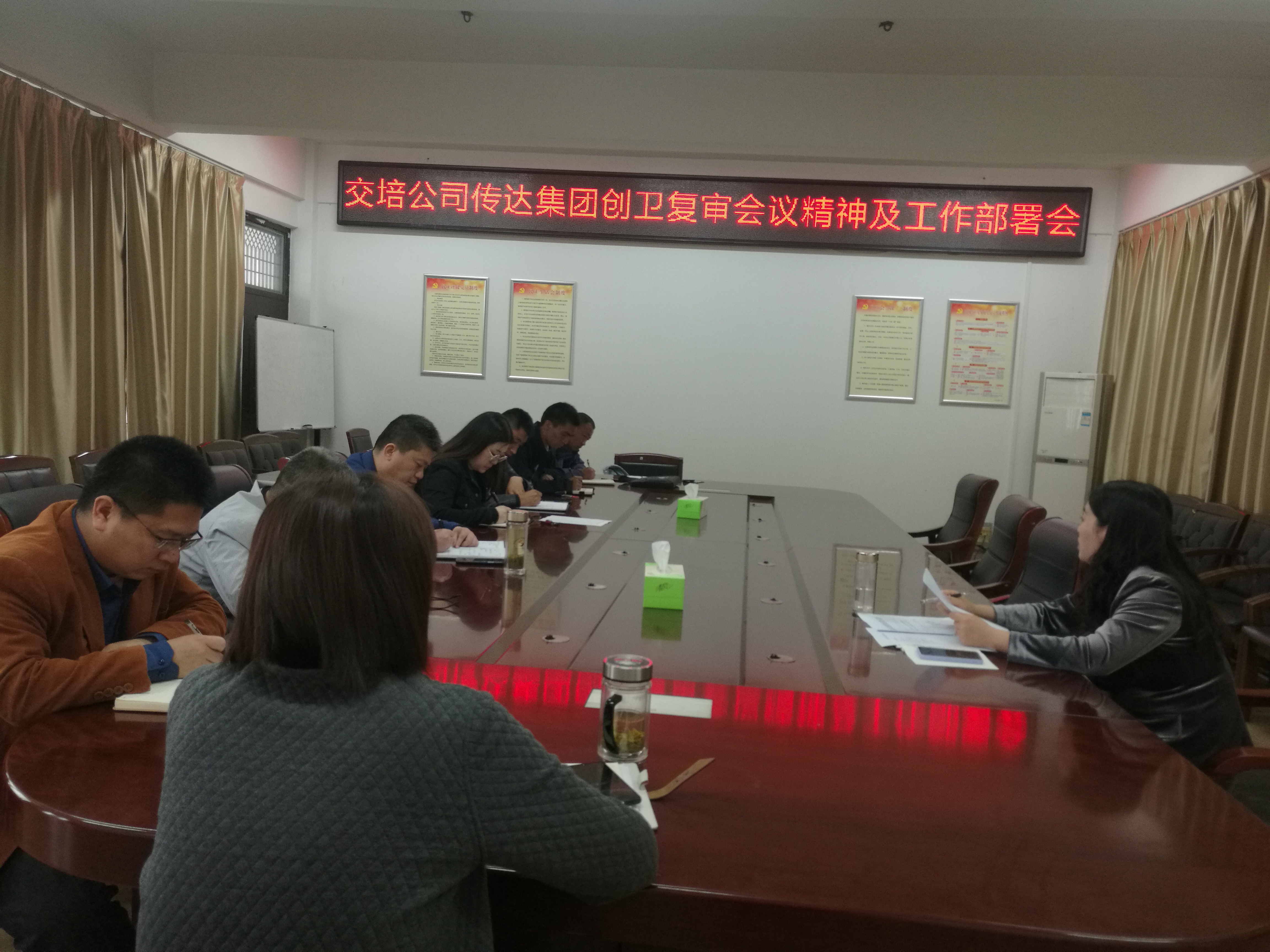 5月12日下午,交培千亿官方网页版召开传达千亿(中国)有限千亿官方网页版迎接国家卫生城市复审工作推进会,会议传达了千亿(中国)有限千亿官方网页版创卫复审工作推进会精神,千亿官方网页版领导、中层干部参加会议。