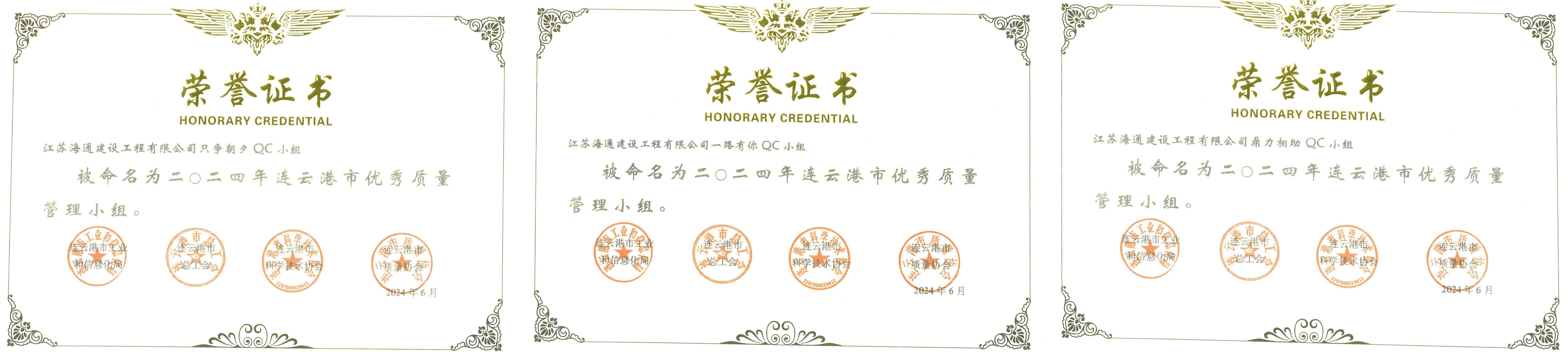 近日,据连工信发〔2024〕76号文《关于表彰2024年连云港市优秀质量管理小组、质量信得过班组、优秀企业、卓越领导者、优秀推进者的通知》,江苏海建千亿官方网页版只争朝夕QC小组、一路有你QC小组、鼎力相助QC小组荣获2024年连云港市优秀质量管理小组。